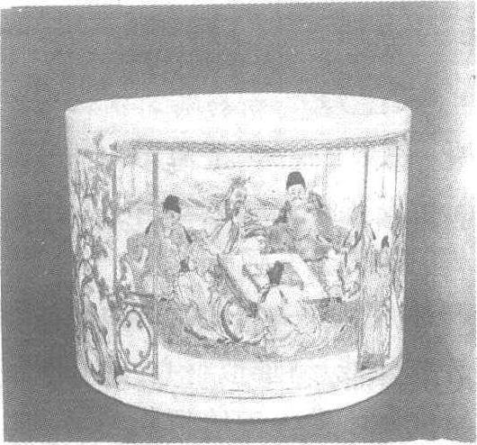 | 释义 | 粉彩人物图瓷笔筒清雍正。高13.3厘米,口径17.4厘米。上海博物馆藏。粉彩瓷器是清康熙时期创烧的一种釉上彩品种,雍正时期得到空前的发展。它是在五彩基础上,吸收珐琅彩制作工艺而成的。所用色料掺以铅粉,加施玻璃白,有意减弱色彩的浓艳程度,使其具有明显的立体感。此笔筒以白釉为地,用粉彩绘人物图,展现出唐代诗人李白与诗友春夜宴桃李园的故事。画工采用中国传统绘画中的没骨法渲染,色阶繁多,使人物和景物均富立体感。图中人物姿态各异,将诗人相聚时开怀畅饮,即兴赋诗的场面描绘得十分生动,是粉彩瓷器中的一件杰作。