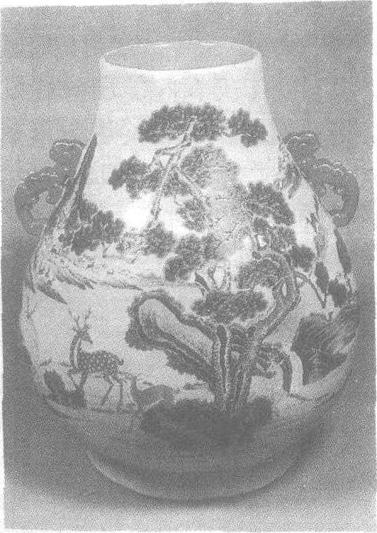 清。口径16厘米,足径24.3厘米,高46.6厘米。北京中国历史博物馆藏。直口,短颈,鼓腹,圈足。器腹内壁施蓝彩,外壁在豆青底色上绘出没色山水及鹿群。器身两侧设有一对红彩描金的云气状系耳。瓷尊造型稳重,釉色典雅,彩画明秀优美,是一件杰出的艺术佳品。