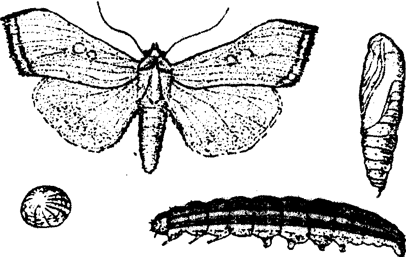 图 2 中国粘虫迁飞路线示意图 发生为害规律 粘虫在各地发生世代数和主要为害世代、历年发生消长与迟早、各虫态的发育进度等主要决定于气候条件,食物营养等其他因素也起一定作用。成虫产卵适温为15~30℃,最适宜产卵的温度为19~21℃,当温度低于15℃或高于30℃时,其产卵数量明显减少。在产卵适温条件下,相对湿度低于50%以下时,产卵量明显下降,对其交配亦有不利影响,相对湿度增高,产卵量随之增加,但饱和湿度亦有不利。幼虫喜湿润而畏干燥,当相对湿度低于40%时,1龄幼虫全部死亡; 相对湿度增高时,幼虫成活率也随之增加。成虫产卵和幼虫低龄时期,雨水协调,气候湿润,粘虫发生则重,气候干燥发生则轻,尤其是高温干旱对其发生更为不利。雨量过多,特别是暴雨或暴风雨的袭击,低龄幼虫种群数量显著下降。 70年代以来,在华北等地区麦套玉米的种植面积明显扩大,二代粘虫的发生与为害随之加重。农田灌溉、施肥、密植等生产条件的改善,使农作物茁壮茂密,农田小气候相对湿度增高,适于粘虫发生,致使粘虫发生为害面积和地区范围有所扩大。华北地区玉米中耕除草,对三代粘虫起到很大抑制作用。 食物营养对粘虫发育与繁殖机能也有一定影响。在同样温湿条件下进行试验,用麦叶饲养幼虫,成活率高,发育快而整齐,幼虫期平均不到20天,均为6龄。蛹较重,平均0.43克左右,成虫期产卵也多,平均1头雌蛾产卵1 900多粒; 而以小蓟为饲料的幼虫,总成活率只有70%左右,幼虫发育慢而不齐,平均约38天,有6~7个龄期,蛹较轻,平均约0.26克。成虫产卵少,平均每头雌蛾产卵不到1 000粒,其发育状况和繁殖力明显减弱。成虫发育与产卵数量多少,与补充营养的关系密切。 蛙类、鸟类、蝙蝠、蜘蛛、线虫、螨类、捕食和寄生性昆虫、寄生菌、病毒等天敌,对其起一定抑制作用。中华广肩步甲和赤胸步甲指名亚种等可捕食大量幼虫;粘虫寄蝇已知有14种,分属于寄蝇科12个属,一代粘虫被寄生率一般达40%以上;粘虫黑卵蜂对粘虫卵的寄生率有时也高;在河南许昌、南阳、驻马店等地,粘虫卵索线虫寄生率有的年份高达80~90%以上。燕、麻雀、蝙蝠等可捕食大量粘虫蛾,瓢虫、食蚜虻、草蛉等也可捕食低龄幼虫。除核型多角体病毒外,70年代又发现粘虫痘病毒。这些天敌在某些年份可形成抑制粘虫发生与为害的主导因素。