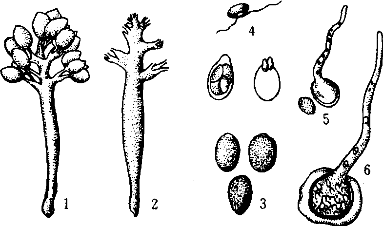1.孢囊梗及孢子囊; 2.孢子囊脱落后的孢囊梗; 3.孢子囊; 4.孢子囊萌发产生游动孢子; 5.休眠孢囊及其萌发; 6.卵孢子萌发