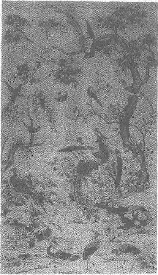 | 释义 | 粤绣百鸟朝凤纹缎清。长125厘米,宽70厘米。北京中央工艺美术学院藏。粤绣又称广绣,是清代著名的地方名绣之一,与苏、京、湘绣合称四大名绣。据明末清初屈大均《广东新语》鸟服条载:“广绣以孔雀毛绩为线缕,以绣补子及云章袖口,金翠夺目。广绣铺针于毫芒,又以马尾缠绒作勒线,勾勒花纹轮廊,自然工整,针步均匀,针法多变,纹理分明。”此缎是以白色为底的经八枚真丝软缎,运用了插针、铺针、钉针、撕针、鳞针、渗针、钉金、勒针、扭针、直针、圆子针、散套与乱针等20几种针法,精心地表现了物象的质感,将物象的形态淋漓尽致地体现出来。图中一凤居中,昂首回望,立于怪寿石之上,凤的头、颈、背、翅、尾为青碧色,凤冠为粉红色,颈部和翅的局部飞羽,凤脚、凤腿为金黄色,凤眼、尾羽上点缀以白色,使凤鲜明艳丽。凤左是一棵结籽的梧桐树,树干、树叶为绿色,以蓝绿勾勒树干边,以淡黄勾叶边,果实为金黄缀黑实籽;树枝延伸横展至图的上部。凤右有一棵矮柳树,树旁傍立一怪寿石,一条潺潺流动的溪流,横卧于图的下部,河中有盛开着荷花,绚丽多姿。在凤鸟的前后左右,梧桐树、寿石、柳树、水溪中有姿态各异的鹦鹉、黄鹂、锦鸡、喜鹊、白鹭、鸳鸯等16只珍禽,或引吭鸣啭、或舞羽翩飞、或顾盼多姿,遥相呼应。整个画幅清丽艳秀,绚丽多姿。