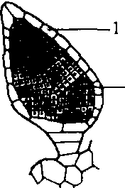 钱苔属的精子器 1. 由一层营养细胞组成的精子器的壁 2. 产生精子的细胞 |