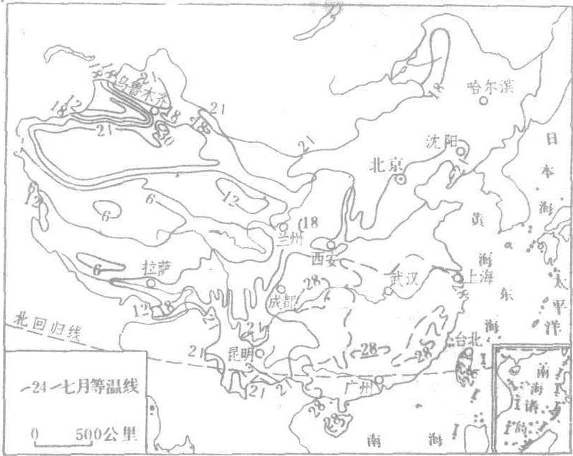 | 释义 | 中国夏季气温分布Zhongguo Xiaji qiwen fenbu中国绝大部分地区7月份为全年最热月,通常人们以7月平均气温分布图来反映夏季气温分布状况。在中国7月平均气温分布图上(见下图),除青藏高原、天山、大小兴安岭以外,全国大部分地区7月平均气温在20—28℃之间,淮河流域以南地区在28—30℃之问,全国普遍高温。7月平均气温,黑龙江省最北部在18℃以上,漠河为18.4℃,海南省的海口为28.4℃,西沙群岛为28.6℃,南北温差仅10℃左右。中国夏季气温分布的特点是:全国普遍高温,南北温差小。形成这一特点主要决定于太阳辐射因素。太阳辐射的多少取决于太阳高度角的大小和日照时间的长短。夏季,由于太阳直射于北回归线与赤道之间,与冬季相比,全国各地的太阳高度角增大,日照时间加长,致使夏季气温明显增高。此时,虽然北方的太阳高度角仍小于南方,但白昼时间却长于南方,补偿了太阳高度角小的热量不足,则北方得到的太阳光热与南方差不多。而南方因受暖湿的夏季风影响大,云量大、降水多,目照时间有所减少,相对降低了气温。在北方,晴日多,日照时间有所增加,气温相对增高。这也是形成夏季南北温差小的原因之一。在中国西部,复杂的地形对气温的影响十分明显。青藏高原因地势高峻,成为全国夏季气温最低的地区,7月平均气温在10℃左右。而内陆盆地,因地形封闭、气候干燥,太阳光照主要用于加热地面和空气,7月平均气温偏高。如塔里木盆地的气温比同纬度的华北平原高,准噶尔盆地的气温比同纬度的东北平原高。从7月平均气温分布图上还可以看出:中国夏季气温分布有两个突出的高温区:吐鲁番盆地是中国夏季最炎热的地区。这里海拔很低,地形封闭,气候干燥,素有“火洲”之称。7月平均气温高达33℃,7月平均日最高气温超过40℃,极端最高气温达49.6℃(1975年7月13日),观测于吐鲁番附近民航机场,为全国之冠。长江中下游地区和四川盆地东部是中国面积最广阔的夏季高温区,因受副热带高压下沉气流的控制,出现伏旱,7月平均气温高达28—31℃,号称“三大火炉”的南京、武汉、重庆,极端最高气温可达43—44℃。 中国历史上记录到的极端最高气温表(℃)