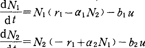 式中 r1、r2、α1、α2为常数。这一组方程实为洛特卡—沃特拉捕食者—猎物系统数学模型。如果在上述两个种群中加进农药因素,则其数量将按下列方程变化: