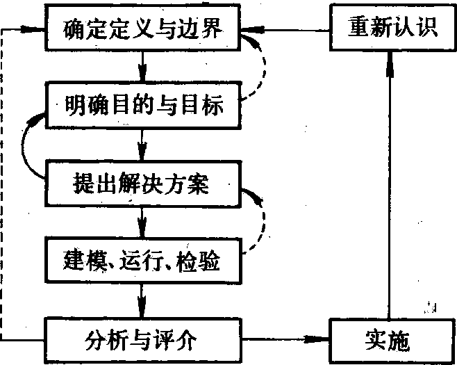 图5 结构模型解析法示意图 首先,根据情况确定应包括的元素集合S和各元素中每两个之间的从属关系R;其次,由S,R求出原始结构图D或其伴随矩阵A;第三,“嵌入”:根据A算出可达矩阵M,Ri和前项集合ai,并求出递阶结构的元素集合SM;第四“分级”:从M算出可达集合。最后,“抽取”:将可达矩阵移位分块,得出递阶结构的分块可达矩阵MH,由MH转换成递阶结构图DH。 灵敏度分析 系统模型的参数在整个系统中是可以改变的,通过灵敏度分析变动系统中的参数,就可检验出各个参数对系统输出的贡献大小。此结果可应用于确定未来的研究方向,并能明确提供研究项目,安排先后次序。如果结合经济效益指标或性能指标等进行动态分析,即可获得对该系统的最优控制方案。 组建系统模型的步骤 通常在组建系统模型时,有6个逻辑步骤: ❶确定模拟对象,即明确研究目标。 ❷应用系统、环境两分法原理确定系统结构,即划出系统的边界。首先确定与系统有关的分量组成系统结构,然后将其余部分都归纳为它的环境。这样设立系统的边界就意味存在着包围系统的外部环境。这对系统在某个过程中的约束条件的形成有直接关系。 ❸建立系统的数学模型: 首先将每个分量从系统中孤立出来研究,建立各个分量的模型,然后根据系统观点,将分量模型,按照各分量之间相互作用的约束条件连结起来构成系统模型。 ❹模型的有效性检验: 即检验组建的系统模型是否符合客观实际,如果不符,还需进行修改。 ❺系统的灵敏度分析。 ❻系统的模拟和控制。 系统分析systems analysis从系统整体考虑,收集关键信息,通过建立模型,对系统的结构、功能和行为特征进行剖析的方法。系统分析的突出特点是自始至终强调研究对象的系统性,注重对象的各种内外联系,其目的在于解释系统现象、辨识系统内在特性、预测系统发展状况和对系统进行优化调控。系统分析是对大量信息进行综合处理、获得系统优化调控方案的一个必要步骤,是解决复杂问题的一种基本途径。杰弗斯(J.Jeffers) 曾将系统分析的全过程归纳为一个与决策有关的多步循环框图(见图)。