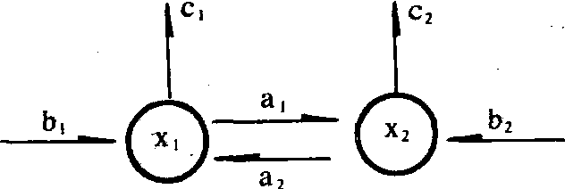 假如将图中各项意义改变一下,x1、x2为钾素的两个库,a1为x1单位库存在单位时间内从x1流向x2的钾量; a1为x2单位库存在单位时间内从x2流向x1的钾量; c1为x1单位库存在单位时间内从x1流向系统外的钾量; c2为x2单位库存在单位时间内从x2流向系统外的钾量。x1为粮食作物地连同作物体中的钾素的库存(千克),x2为饲料作物地连同作物及牲畜体中钾素的库存(千克),b1和b2分别为系统外向x1和x2输入钾素的速度(千克/天)。则这个系统的钾素流动模型是