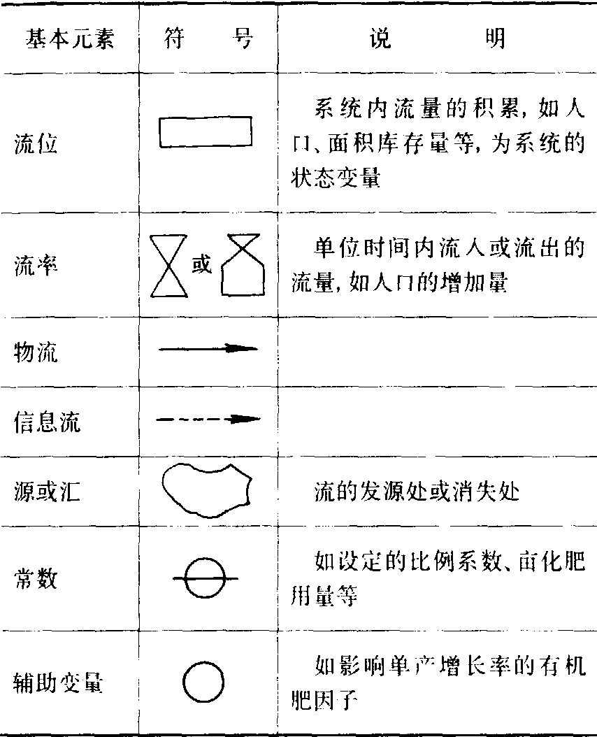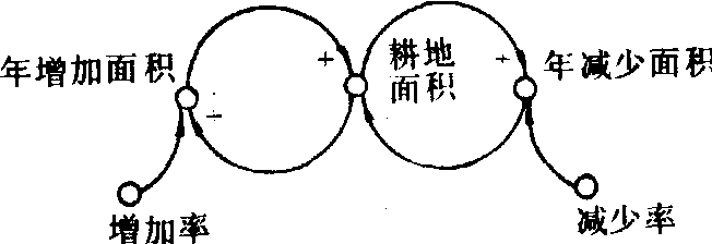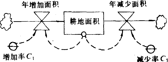 图1 耕地面积因果关系图 流程图 用一套专用符号来描述系统内部和系统与环境间物质、能量、信息流动的图。它的特点是直观、易理解和便于检查。流程图中最基本的元素是流位(Level)、流率(Rate)、物流、信息流、源或汇(见表)。在图1基础上建立的流程图如图2所示。 流程图图例表