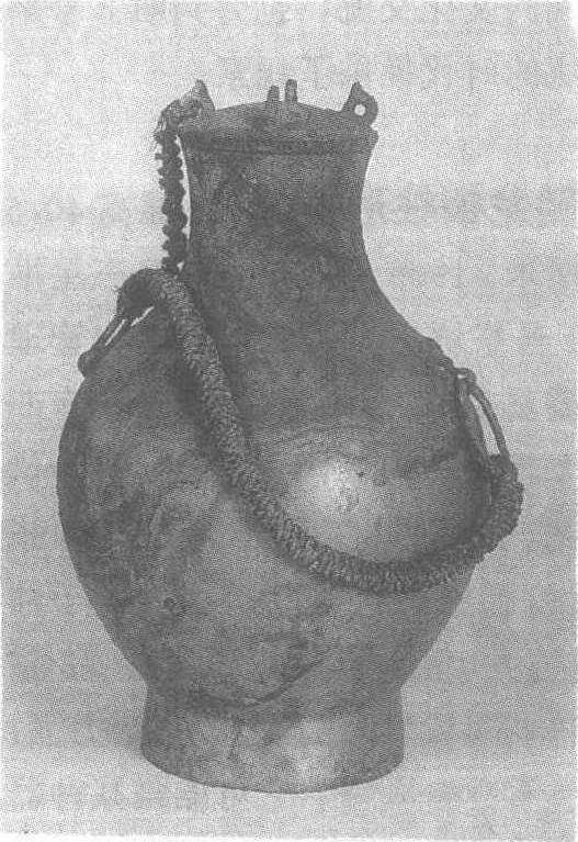 战国。盛酒器。通高35.3厘米,口径9.7厘米。1980年四川省新都晒坝出土。四川省博物馆藏。此壶直口,膨腹,圈足。通体素面。盖上有四个兽形环钮,腹两侧有铺首衔环双耳,环上系有棕绳提梁,并用一短索将盖系于耳上。这种用棕绳作提梁的壶,保存如此完整,前所未见。