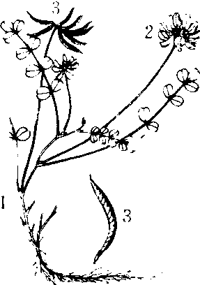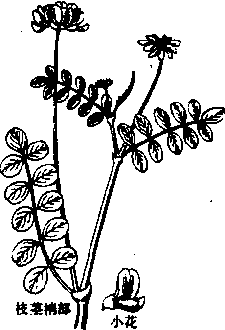 紫云英 1.枝茎梢部 2.花 3.荚果 4.根系 紫云英越年生豆科草本植物,稻田种植的主要冬季绿肥品种,优质的绿肥饲草。又称红花草、江西苕、小苕。在川西平原种植历史悠久,其他市、地均有种植。有130多个品种,分早熟种、中熟种、晚熟种,主要品种有莲选2号、新会、川西、醴陵、余江大叶子等品种。全生育期190天~210天左右。四川一般10月上、中旬播种,翌年3月中旬收青,5月上旬左右收种。70年代中期,全省种植面积达400多万亩,现种植面积60余万亩,鲜草亩产1500千克~2500千克,种子亩产3千克~50千克。 |