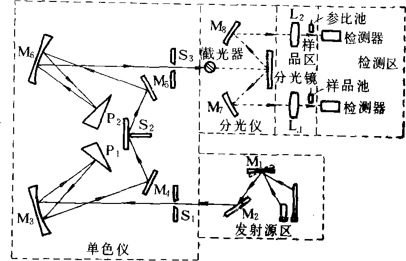 仪器结构 一般的紫外光谱仪(包括可见光区)由光源、单色器、检测器三个部分组成(图2)。在紫