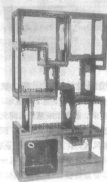 | 释义 | 紫檀多宝格清乾隆。高123.5厘米,宽70厘米,深30厘米。河北省承德避暑山庄藏。多宝格又称“十锦槅子”、“集锦格子”等,是用来陈设各种古玩的家具。此格总体呈长方形,中间分成许多错落有致、高低相间的小格。格边牙条有的镂孔,有的加委角波折框。上饰黑漆描金的回纹、拐子纹及云纹等。有些格壁还开有椭圆、长方、方形等开光。以便观赏陈设品。它的下边本来还有彩漆双抽屉座,后失散于动乱中。此多宝格制作得十分精美,为乾隆时期的家具精品。