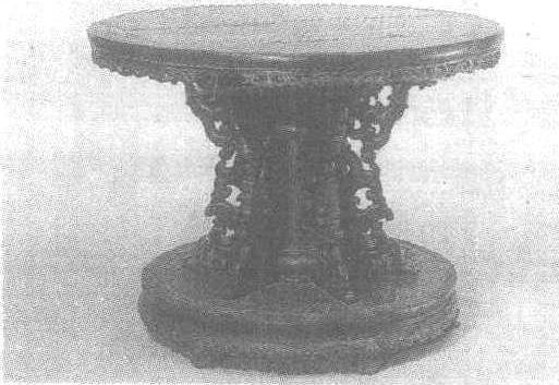 | 释义 | 紫檀漆面圆桌清。面径118.5厘米,通高84.5厘米。北京故宫博物院藏。桌面为圆形,犀皮漆面心。面下有镂空的如意头形纹饰的牙条。柱形独腿安置在须弥式托泥座上。托泥座底边刻着凸凹起伏的如意形卷云纹,并设6个如意头形足。桌面与托泥座间,以独腿为中心,6个角牙镂雕许多纠缠为一团的蟠螭纹,犬牙交错,上承桌面,下连托泥。腿中分,上有轴、下有孔,可使桌面左右转动。据内务府档案载:“雍正八年十月三十日,内务府总管海望奉旨:尔照年希尧进来的番花独挺座方面桌,或黑漆或红漆的做一张。桌面……要做圆的,座子中腰安轴,要推的转,钦此。”由此可见,这类圆桌的制作是从雍正(公元1723—1735年)时期开始的。此桌造型厚重,纹饰繁缛,为典型的清式家具。