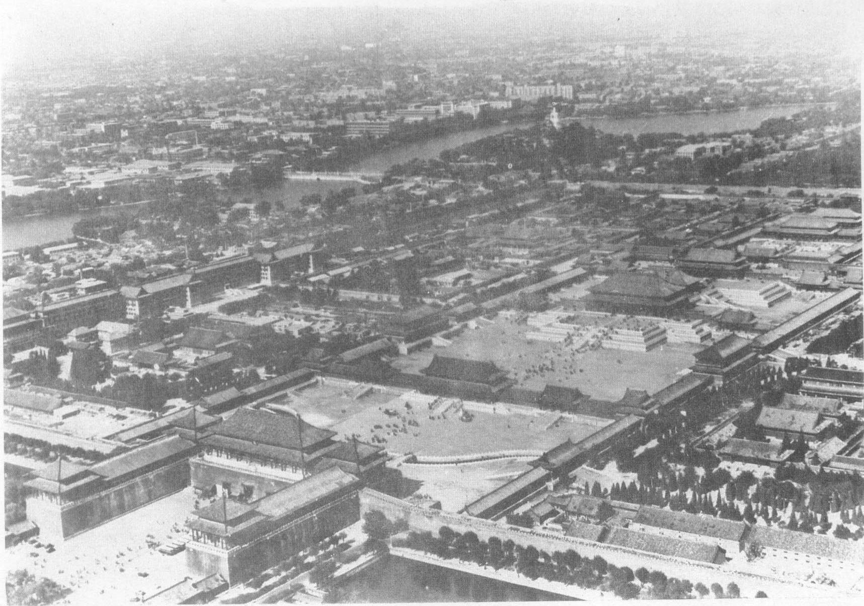 图57 故宫鸟瞰 紫禁城明、清两代的皇宫。位于北京城中皇城的东南角。明朝14个皇帝、清朝10个皇帝先后居住在紫禁城,成为明清政治中心。明成祖朱棣登基称帝后,决定迁都北京,于永乐四年 (1406) 开始大规模新建、扩建新皇宫。永乐十八年 (1420)竣工,第二年正月正式迁都北京。紫禁城占地面积72万平方米,南北长960米,东西宽760米,周长3. 4公里,总建筑面积为16万平方米,房间9900余间。清朝基本沿袭了明紫禁城的建筑规模,除改变了部分宫殿名称及改建了个别宫殿外,总的建制变化不大。紫禁城周围环有高3丈多的宫墙,墙外是15丈6尺宽的护城河。南面是正门午门,北门为神武门,东门为东华门,西门为西华门。午门后是一方形广场,有弯曲的金水河横贯,河上跨五座汉白玉单拱石桥,桥北是九楹重檐三门崇基的太和门,其两侧并列昭德、贞度二门。广场东西有通往文华殿和武英殿的协和、熙和二门。紫禁城四角各有一座角楼。角楼重檐三层,第一层四角,第二层十二角,第三层十二角,共二十八角。整个紫禁城宫殿分为外朝和内庭两部分。外朝以太和、中和、保和三大殿为主体建筑。三大殿建在一个工字形三层汉白玉的巨大台基上,四周廊庑环绕,气势十分壮观。太和门东、西两侧分别是文华殿和武英殿。这里有高大的宫门和宽阔的御路,是皇帝召见群臣、行使权力的主要场所。保和殿后有一被称作“横街”的地段,它是外朝与内廷的分界。内庭从乾清门开始,在中轴线上依次是乾清宫、交泰殿、坤宁宫等建筑。内庭中路东西各有六组自成体系的院落,即东六宫和西六宫。东六宫分别是景仁宫、承乾宫、钟粹宫、延禧宫、永和宫和景阳宫; 西六宫分别是永寿宫、翊坤宫、储秀宫、启祥宫、长春宫和咸福宫。每组宫院都以前后殿、东西庑的标准格局建成。东六宫南面有奉先殿、斋宫和毓庆宫。西六宫南面是养心殿。东六宫以东有宁寿宫一组建筑,俗和“外东路”。西六宫西南及西面有慈宁宫、寿康宫、寿安宫、英华殿等。宫城北面是钦安殿,殿东面是乾清宫东五所、西面是乾清宫西五所 (后改建为重华宫)。另有花园三座,御花园在故宫中线的煞尾处,宁寿宫花园在宁寿宫养性殿之西,慈宁宫花园在慈宁宫南面。紫禁城建筑有殿、堂、楼、阁、亭、轩、廊、庑等,瓦顶全部用黄琉璃筒瓦,包括庑殿顶、歇山顶、攒尖顶、硬山顶、悬山顶、盝顶等多种造型,形式各异,金碧辉煌。紫禁城的建筑格局是四周高大、中央低矮,俗称“砂锅底”。中央部分的宫殿利用宫门和汉白玉底座来增加高度,使得外观上依然十分协调。若站在景山远眺紫禁城,除钦安殿和三大殿尚可大致看清轮廓,其他殿堂大多隐匿于层层黄色琉璃瓦殿脊之下而难见其踪影。明永乐十九年 (1421)、嘉靖三十六年(1557)、万历二十五年 (1597) 都发生大火灾,三大殿均被焚毁紫禁城也几乎化为灰烬。火灾过后,又耗巨资重新修建。明朝末年,李自成农民军攻入京城,紫禁城因战火亦受到很大破坏。清顺治、康熙、乾隆年间多加修葺,又更改部分宫殿名称。1923年因宫中太监纵火而引发了一场特大火灾,建福宫一带的建筑均被烧毁。清亡之后,紫禁城成为重要文物单位,1925年成立 “故宫博物院”,也称为“故宫”。这里的重重殿宇、层层楼阁,集中了明清建筑之大成,保存了大量珍贵文物,荟集了我国古代文化的史料和掌故,是中华民族文明宝库中的无价瑰宝。