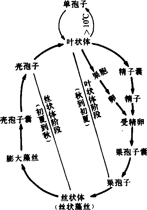 当叶状体生长到20厘米左右时应进行采收加工。坛紫菜约在11月中旬开始采收,条斑紫菜稍晚。通常10~14天可采收一次,约采收7~8次。叶状体采收后应及时加工成菜片,加工工序大致分拣菜、洗菜、切碎、制片、脱水、干燥、剥离、包装。干燥可烘干或太阳晒干。再经第二次烘干,使含水量降到2~3%,用铝袋纸箱密封,置-20℃冷库内可保存3年不变质。 紫菜丝状体培育过程常见的病害有: 黄斑病、泥红病、绿变病、白圈病、龟纹病、鲨皮病、赤变病和白斑病。黄斑病和泥红病是微生物病害,绿变病是生理性病害,发病后如不及时处理会使丝状体大量死亡。黄斑病发病时先在贝壳表面产生许多圆形黄色小斑点,后逐渐扩大连片。可用1.005的低密度海水浸泡两天或淡水浸泡1天,也可用10ppm对氨基苯磺酸浸泡15小时或2ppm高锰酸钾浸泡15小时都有效,也可用漂白粉处理。泥红病发病时贝壳表面呈泥红色,手摸有粘滑感,有臭腥味。可用0.01%漂白粉冲洗贝壳或用1.005低密度海水浸泡两天,抑制病情蔓延。绿变病发病时贝壳表面黄绿色,后变白死亡。这种病是营养不足所致,应添加营养盐并适当减少光照。丝状体病害多发生在水温高的季节,尤其易发生在培养海水未经严格处理时。因此,培养海水经严格过滤和沉淀是防止病害发生的重要条件。 叶状体养成过程常见的病害有:赤霉病、壶状菌病、白腐病、绿变病、癌肿病和烂苗病。易发生在海区筏架排放过多时。赤腐病由腐生霉引起,发病时叶状体上有红色小斑点,后迅速扩大,叶状体不断从病斑处脱落。可用酸碱性表面活化剂、非离子表面活化剂等杀死菌丝,也可在发病初期增加叶状体干出时间抑制发病,冷藏法亦可除去部分病菌。壶状菌病在中国尚未发现。发病时肉眼不易察觉,病情较重时叶状体褪色且前部边缘出现黄色病斑,一旦发病不易控制。日本用核染色法及时发现病菌,将紫菜网帘入库冷藏,以减少在海区内感染蔓延。白腐病因叶状体干出不足、水流不畅及光照不足所致。发病初期叶状体前端变红,后由黄绿变白,逐渐溃烂、流失。浮架和网帘排放不要过密,网帘要绷紧,保证足够的干出时间,及时采收,使水流畅通等可抑制此病。绿变病发病时叶状体变绿,后腐烂流失。发病前及时下降水层并施肥,可防止或减缓绿变病的损失。癌肿病发病时叶状体皱缩,色黄带黑,无光泽,呈厚皮革状。此病多由工厂废水排放使海水中含有毒物质引起,应消除海区污染源或避免在这些海区进行栽培。烂苗病一般在幼苗时发生,幼藻体逐渐褪色,后尖端变白,藻体弯曲,腐烂流失。采苗时防止密度过大,筏架布局要合理。日本采用发病前将网帘入冷库冷藏的办法效果很好。 紫菜藻类蔬菜。生于浅海潮间带的岩石上。藻体呈薄膜状,紫色、褐黄色或褐绿色。 紫菜Zicai红藻门植物。紫红色叶状体,多数仅由1层细胞组成。藻体成圆形、卵形、披针形、全缘或有皱褶,长20—30厘米。基部细向下延伸出来的假根丝组成盘状固着器,藉以固着在各种基质上。有无性生殖和有性生殖。叶状体可视为配子体,为单倍体,在水温高于10℃时,它的每个营养细胞可转化形成1个单孢子,释放出来后,可直接萌发成1个紫菜叶状体。有性生殖过程有2个阶段,一为叶状体阶段,可视为配子体,一为丝状体阶段,可视为孢子体,减数分裂发生在壳孢子的时候。所以,紫菜的生活史为具有世代交替的类型。我国沿海常见的紫菜有甘紫菜、条斑紫菜、坛紫菜等。是营养价值较高的美味食品和调味料。 紫菜Porphyra红藻门的代表植物之一。生活在浅海潮间带岩石上,藻体薄膜状,营养部分仅由1~2层细胞构成,呈紫色、紫红色、暗绿色或紫蓝色。主要分布在我国黄海南部、东海、南海沿岸。我国北部海区主要生产和养殖甘紫菜(Porphyra tenera),味道甘美,青岛、荣城、大连以产边紫菜著称,福建、浙江等地,特别是福建平坛盛产坛紫菜(Por-phyra haitanensis),均可供食用。紫菜含有蛋白质、糖类、脂肪、维生素B1、B2、胆碱、多种氨基酸、胡萝卜素等物质。具有降低胆固醇的作用和化痰、清热利水、补肾养心的功效。 紫菜红藻门原红藻纲紫菜目红毛菜科紫菜属藻类的统称。中国1000多年前已出现紫菜养殖。紫菜属约有70多个种。紫菜由盘状固形物、柄和叶片3部分构成。生长由叶状体(配子体)和丝状体(孢子体)2个阶段组成。紫菜含蛋白质约为29%~35%,还含有碘、多种维生素及无机盐类。 |