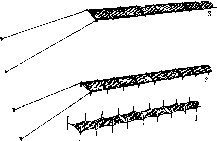 图 1 紫菜生活史 种类 紫菜属约有30种,中国有10种。栽培利用的主要种有: ❶圆紫菜(P.suborbiculata Kjellm.), ❷皱紫菜(P.crispata Kjellm.), ❸长紫菜(P.den-tata Kjellm.), ❹坛紫菜(P.haitanensis T.J.Changet B.F.Zheng), ❺甘紫菜(P.tenera Kjellm.), ❻条斑紫菜(P.yezoensis Ueda.), ❼边紫菜(P.marg-inata Tseng et T.J.Chang)等。北方以条斑紫菜为主,南方则以坛紫菜为主。 栽培技术 紫菜人工栽培分丝状体培育和叶状体养成两个阶段。 丝状体培育阶段 春末取成熟的叶状体经阴干刺激后,放入盛有海水的容器内放散果孢子,当放散量达到要求时,捞出叶状体。把孢子水按一定比例喷洒到已放有贝壳的培育池内,果孢子即附着到贝壳上,萌发钻入贝壳内生长成丝状体。秋季水温下降时,贝壳内丝状体成熟并放散壳孢子,将维尼仑网帘放入培养池内采苗,不断搅动池水使壳孢子均匀附着网帘上,然后张挂到海上的人工筏架上,即进入叶状体养成阶段。在丝状体培育过程中,要定期洗刷贝壳、换水、施肥、调光等,以保证其正常生长发育。 叶状体养成阶段 有三种栽培方式: ❶支柱式栽培。在适合叶状体生长的潮间带滩涂上平行安设木桩或竹桩作支柱,网帘水平张挂在支柱上进行栽培。此法产量低,每平方米网帘生产紫菜100~500克,中国已不使用。在日本仍是一种重要的生产方式。 ❷半浮动筏式栽培。半浮动筏架在涨潮时可以漂浮于水面,退潮到筏架露出水面时又可以靠短支腿平稳地竖在海滩上。半浮动筏架设置在潮间带的一定潮位上,网帘水平张挂在筏架的空格内。由于网帘在退潮时能露出、日晒(称干露),杂藻不易附生,有利于紫菜幼苗的发生和生长,且生长期长,紫菜的产量高,质量好,每平方米网帘生产紫菜500~1 000克。 ❸全浮动筏式栽培。这是适合不干露的浅海区栽培方式。网帘水平张挂在筏子的空格内,栽培期间网帘飘浮在水面上。如果出苗好,管理得当,产量和半浮动筏式相近。但由于网帘不干露,对叶状体的健康生长和对抑制杂藻的繁生不利,故在网帘下海后的20~30天内,要适当干露网帘(图2)。