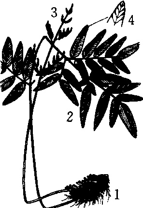 紫萁 1. 根状茎 2. 不育叶 3. 能育叶 4. 不育叶放大,示侧脉二叉 |