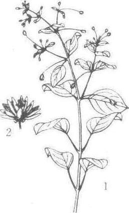 繁缕 1. 植株 2. 花 繁缕一二年生草本。须根,茎多直立或斜伸。叶卵形。花多数,成顶生聚伞花序。种子多数,肾形,稍扁,褐色。产阿勒泰、布尔津、哈巴河、和布克赛尔、塔城、霍城、伊宁、尼勒克、特克斯、昭苏等地。全草入药,具有消炎、凉血、抗菌的功能。可作饲料。 |