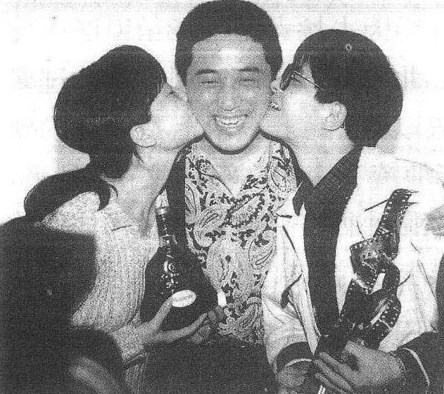 两位小演员向叶大鹰导演祝贺《红樱桃》获奖