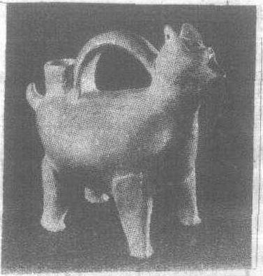 | 释义 | 红陶兽形器新石器时代大汶口文化陶制水器。1959年泰安大汶口遗址(宁阳县堡头村部分)出土。夹砂红陶质,兽形圆面,耸耳,拱鼻,张口,四足,短尾上翘,背装提手;耳穿小孔,尾根有筒形口可受水,嘴可注水;体肥壮,似猪形。通体施红陶衣。器物造型生动,栩栩如生,堪称古代制陶工艺珍品,充分反映出大汶口文化制陶工艺的高超水平。器高21.6厘米,长22.4厘米。现藏山东省博物馆。