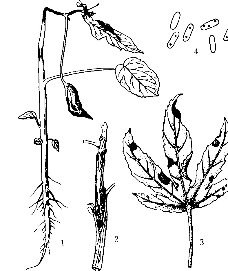 病因 病原物为红麻炭疽菌(Colletotrichumhibisci Pollacci),属半知菌,黑盘孢目。该菌的有性态在自然界和培养基上均未发现。大量分生孢子产生在分生孢子盘上,呈橘红色,极少见到刚毛。分生孢子单胞无色,内有发亮的油球; 大多长圆筒形,有的中部稍缢缩,少数长椭圆形,大小8~16×3.5~6(微米)。在马铃薯琼脂培养基上,菌落早期呈土黄色或橘红色,以后多呈深灰色。病菌在23~26℃下生长最好,产孢量最多,28℃以上生长受抑制。培养基中加入氮素营养有利于病菌生长,加入感病麻株的嫩组织煮出液可提高产孢量。红麻炭疽病菌在中国为害红麻和玫瑰麻,在危地马拉可轻度为害拟红麻锦葵属(Malva sp.)植物。根据在不同品种上的致病力差异,红麻炭疽病菌可分为不同生理小种。美国鉴定3个小种。赞比亚发现1个不同于美国的新小种。中国于1976年由多个单位联合鉴定,在4个鉴别品种上分为4个生理小种,其中4号小种是致病力最强的优势小种,能严重侵染抗美国3个著名的致病小种的红麻品种Ev-41和Ev-71,表明中国的优势小种与美国报道的小种不同。此外,还有鉴别为2个生理小种的报道。 红麻品种对炭疽病的抗性有明显差异,种植感病品种是大流行的主要原因。20世纪50年代初,世界植麻区大面积种植感病品种,导致该病流行成灾。自60年代以来,先后选育和推广了抗病品种,使该病未能在大范围内流行。红麻种质对炭疽病菌的抗性遗传呈显性表现,而且受一对以上的抗性基因控制,通过系统选育提高其抗病性作用不大。杂交育种的亲本,要有一个以上高抗炭疽病菌的基因,才可能选育出抗病后代。红麻种质对炭疽病菌的抗性表现,还需有足够的光照,抗病种质在光照不足的条件下,抗病性将降低。 在有菌源及种植感病品种的条件下,湿度大小是影响病害大发生的原因之一。即使初侵染菌源少,由于病菌潜育期短,产孢量大,阴雨天气持续时间长,相对湿度大的年份,发病较重。中国北方麻区7、8月份为发病高峰期,长江流域麻区在5、6月及9、10月份出现两个高峰期,发病与当地的雨季相吻合。大气湿度低的新疆石河子地区,即使种植带菌的塔什干感病品种,田间调查仍不发病,所获种子也不带菌。 此外,种子带菌率高低影响苗期发病的轻重。麻地地势低洼、积水; 苗期偏施氮肥,麻株生长柔嫩; 间苗不及时,造成麻苗拥挤,有利发病。合理增施磷钾肥,促进红麻茎秆纤维发育,可提高抗病性。 侵染过程和病害循环 病菌孢子在有水滴条件下萌发后直接侵入寄主柔嫩组织。在25℃下潜伏期3~4天。炭疽病菌的寄生机制与红麻组织中酸度变化有关,红麻组织的pH值一般为4.0~6.0,当炭疽病菌接触寄主后,菌丝分泌物可透过寄主细胞扩散到周围组织细胞中,使其呈碱性反应(pH值8.5),寄主酶系统受到破坏,引起组织坏死或接近坏死,然后病菌侵入。病菌也可随导管中的液流传到寄主其他部位,主要分布在韧皮部的细胞内和细胞间。 带菌种子是该病菌远距离传播的媒介和初侵染的主要来源。种子表面附着分生孢子。种皮内潜伏菌丝体。在低湿干燥条件下,病菌在种子内可存活3年。残留在土中病残体上的病菌能越冬成为翌年初侵染菌源,病菌在土中不能越夏。主要借雨露溅沾病菌分生孢子或通过健病株的接触而再侵染。因此再侵染的自然传播距离有限。 病害控制 主要采取以下措施: ❶严格执行检疫制度,防止中国没有的小种传入。 ❷带菌种子用退菌特、炭疽福美、拌种双以有效成分计,按种子量0.5%拌种,或用0.5%退菌特、0.8%炭疽福美、0.5%拌种双药液浸种一昼夜,能减轻苗期受害。 ❸种植抗病品种和建立无病留种田,或在无病区繁育种子可有效的控制。中国已有抗病高产品种湘红1号、湘红2号、72-2、粤74-3、浙萧麻1号等。美国的Ev-41、Ev-71,南非的GR-25/63,埃及的Giza 3号等品种也能高抗所在国的红麻炭疽病菌生理小种。中国的71-4、7805和85-224等材料抗病性极强,可作抗病育种的亲本。此外,轮作换茬,开沟排水,及时间苗定苗,避免偏施氮肥,合理增施磷钾肥,均可减轻病害蔓延。 ❹发病初期用50%退菌特400~600倍,80%炭疽福美800倍,50%克菌丹600倍喷雾。印度用多果定(dodine)或福美锌喷雾,均有 一定效果。 红麻炭疽病kenaf anthracnose红麻的一种重要真菌病害。中国除新疆外,各红麻区均有发生。病原菌是半知菌亚门的木槿刺盘孢菌(Colletotrichum hibisci Pollacci)。地上部幼嫩组织均可受害。病苗猝倒死亡。子叶上产生不规则形暗红色病斑,可蔓延至顶芽,导致黄褐色腐烂。叶斑圆形,紫红色,中央浅灰色。茎上病斑梭形,略凹陷,黄褐色,边缘紫红色,常引起茎折或烂头。花蕾、蒴果也可受害。潮湿时病部产生橘红色胶质物(病菌的分生孢子)。初侵染源是带菌种子及病残体。干燥条件下病菌可在种子内存活3年或单独在土壤中长期存活。种植感病品种易引起病害流行。雨季早、两量多有利于发病,连作及偏施氮肥的麻地发病重。病菌有生理分化,在中国有2个生理小种。宜采取植物检疫、选用抗病品种、种子处理和喷洒药剂等措施防治。 |