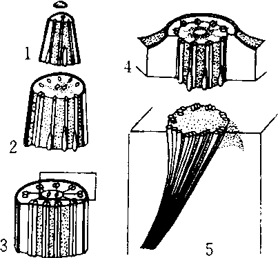 纤毛分段立体模式图 1.纤毛尖部 2. 纤毛尖细部 3. 纤毛中部二联微管 4. 纤毛与基体间移行部 5.基体三联微管构成风车状同中心粒 |