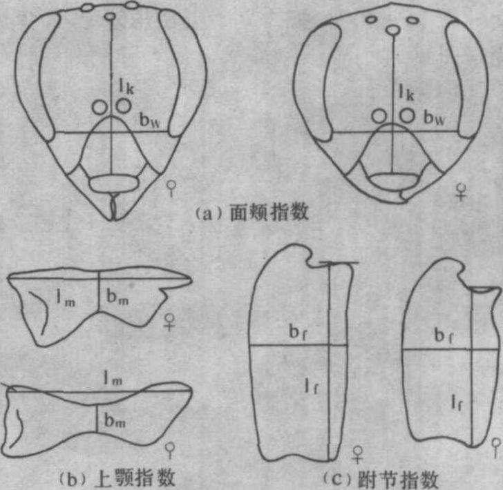 蜜蜂两种级型在发育阶段上的差异也比较明显,表2列出了蜂王和工蜂发育过程的时间顺序。所有幼虫都是在卵产下后的第3天末孵化,工蜂幼虫的巢房在第8天之后被封盖,蜂王幼虫却在7天半之后。蜂王的蛹期大大缩短。体重较大、寿命很长的蜂王从卵到成虫的发育期较短,只需16天,工蜂却推迟到21天才进入成虫期。 在室内人工培养蜂王时,经常出现中间型;为了便于区分,科技人员在鉴别蜜蜂级型的某些外部形态特征时,时常采用下列三个指数:❶面颊指数=面颊长/面颊宽(lk/bw); ❷上颚指数=上颚长/上颚宽(lm/bm); ❸跗节指数=跗节长/跗节宽(lf/bf)(见图2)。蜂王的这3个指数均较工蜂的小(见表1)。 从蜜蜂受精卵孵化出来的所有雌性幼虫在身体结构上都相同。用3.5日龄以下的小幼虫都可以培育成蜂王,而用3.5日龄以上的较大的幼虫只能培育成工蜂或具有一些蜂王特征的中间型工蜂。因而人们普遍认为蜜蜂级型产生的差异是由于哺育蜂给予雌性幼虫的饲喂和饲料质量有差异所致。工蜂幼虫在最初3天受到密集饲喂,即供给它们较多的食物,以至幼虫漂浮在食物里;但在3天以后,直到第5天末巢房封盖为止,就改为间断饲喂,每次只喂一点食物。蜂王幼虫则在整个幼虫期都受到密集饲喂,食物始终有剩余,王台封盖以后,王台里还有大量剩余食物。饲喂蜂王幼虫的王浆与饲喂工蜂幼虫的幼虫饲料在质量上也有很大差异。王浆含有较多的泛酸、生蝶呤和新蝶呤。两者含有的营养腺和上颚腺分泌物的比例也不相同。王浆中含有浓度较高的糖,可刺激幼虫体内咽侧体的发育,使其产生较多的保幼激素。蜂王幼虫咽侧体的容积平均为0.0024立方毫米,工蜂幼虫的仅为0.0017立方毫米。(见蜂王浆) 也有人认为,蜜蜂雌性幼虫两种级型的差异,是由于在生物学功能上的不同而引起的。蜜蜂级型分化的原因仍然是个有待探讨的课题。 |