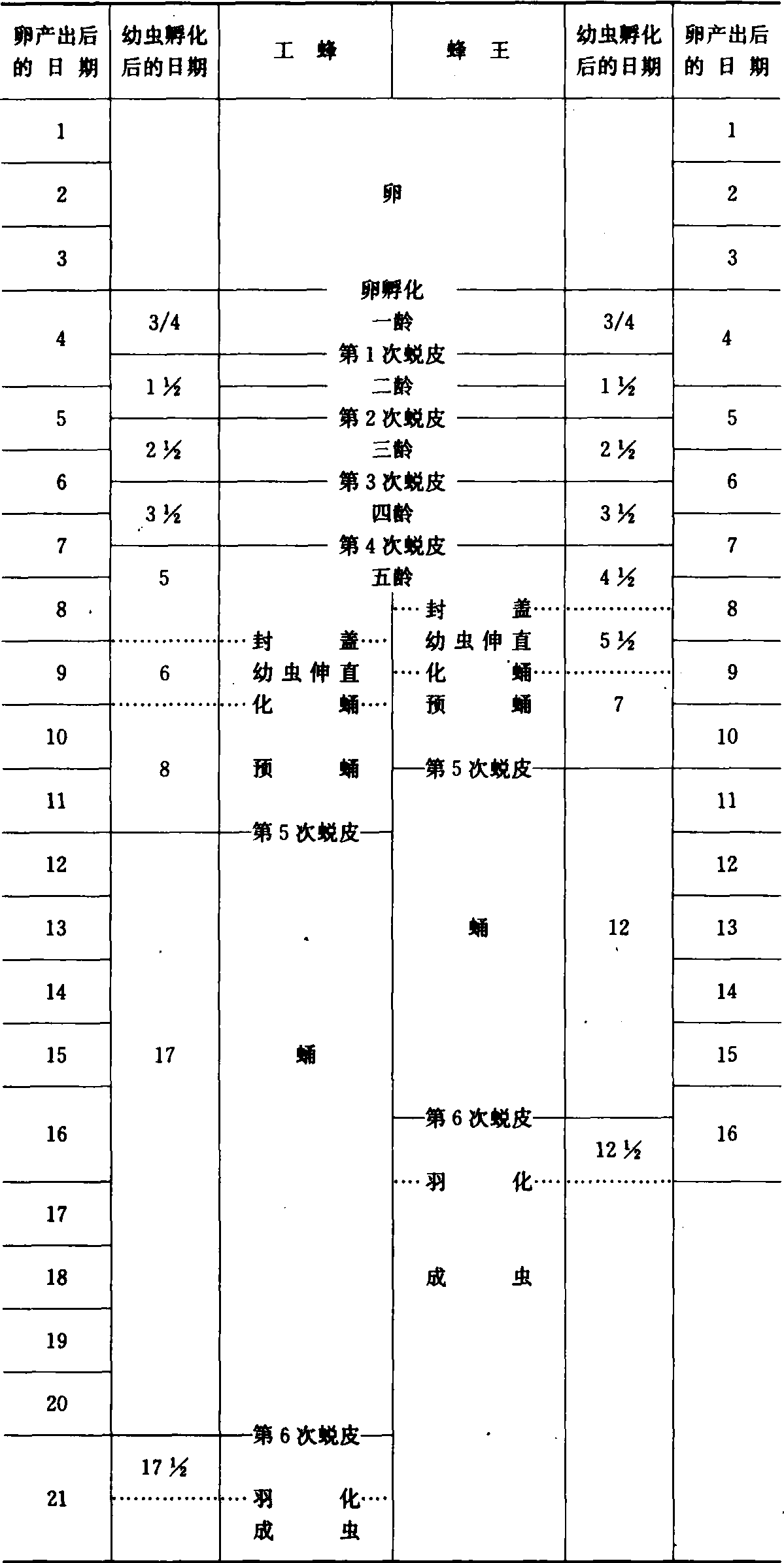 图2 工蜂和蜂王外部形态特征的3个指数(仿Berthelf,1925) 表2 蜜蜂雌性两种级型的幼虫和蛹的发育阶段(日期)