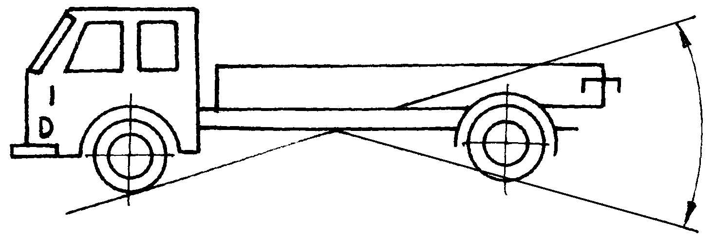 汽车在满载静止状态下,当垂直于汽车纵向平面的两平面,分别切于前后车轮的外缘,该两平面的交线触及底盘下部较低的部位时,在车轮之外,两平面之间所夹的最小锐角。表征汽车通过小丘、拱桥等障碍物的能力。纵向通过角愈大,汽车通过性愈好。