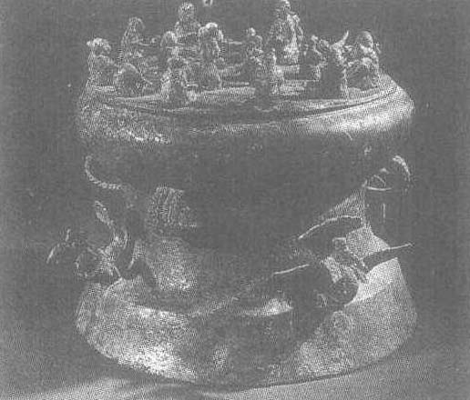 | 释义 | 纺织场面铜贮贝器西汉。滇族统治者贮存贝币的用具。高21厘米,云南省晋宁石寨山出土。北京中国历史博物馆藏。铜鼓形,有四耳,胴部和下部有线刻、圆雕孔雀各四只。器盖上铸女俑18人,滇族形像的有7—8人,余为不同部族的女子。内容反映的是家庭手工业从事纺织劳动的场面。体形较大而通体鎏金坐于矮塌之上的女子,是群俑之中的滇族奴隶主,其后有滇族和别族侍女,她正监督着其他奴隶从事劳动,这些女奴多为别族妇女,她们或撚线,或足踏腰机,有的织布有的捧杼,各行其事。西汉时期,滇国的奴隶制已很发达,奴隶是当时社会的主要劳动力,买卖奴隶,通过战争劫掠奴隶的现象是很普遍的。男人主要从事畜牧,狩猎和战争,家庭手工业,农业生产则由女人完成。此件贮贝器为我们了解当时社会分工的情况提供了很好的实物例证。