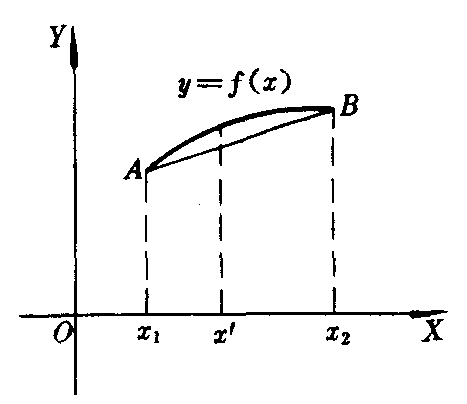 线性插值法的几何意义是在点A(x1,y1)和点B(x2,y2)之间用直线近似地代替曲线(如图).x1和x2两点距离越小,所得f(x′)的近似值精确度越高. 由于一次函数的值容易算出,因此这种方法有实用意义.在使用函数表求函数值时,可以利用这种方法确定在表中不曾列出的函数值. 例如,利用指数函数ex表求e0.627.在表中可以查到e0.62=1.8589和e0.63=1.8776.若查不到e0.627,则在区间〔0.62,0.63〕上,将函数y=ex的关系式用一次函数