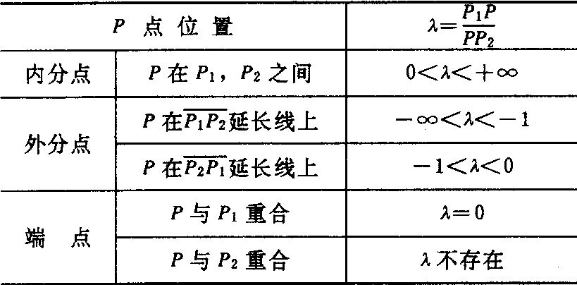 有向直线l上的一点P,把l上的有向线段分成两条有向线段和和的数量之比λ=P1P/PP2叫做点P分所成的比,点P叫做的定比分点.若点P在线段P1P2上,则点P叫做的内分点;若点P在线段P1P2的延长线上,则点P叫做的外分点.P点在l上的不同位置和λ的不同数值之间的对应关系如下表所示: