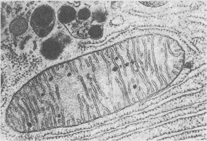 图 2 线粒体电镜图像 化学组成与功能 细胞的呼吸过程,除了糖酵解在细胞质中进行外,其余重要步骤如三羧酸循环,生物氧化和氧化磷酸化作用都在线粒体内完成,其中三羧酸循环的作用部位在基质,生物氧化和氧化磷酸化作用则在内膜上。 外膜 组成与细胞膜相似,脂类含量相对较高(蛋白质和脂类为1:1),磷脂主要为卵磷脂,其次为磷脂酰乙醇胺,磷脂酰肌醇较少,胆固醇量极微。通透性较大,水、电解质、蔗糖、尼克酰胺-磷酸核苷(NAD)和腺苷多磷酸(ATP和ADP)等及分子量小于1×104的质点都能自由通过。膜上还存在电压依赖阴离子选择通道,它是分子量3×104~3.5×104的蛋白质组成的孔道,表观直径2~4nm。阴离子(如Cl-)的通过速度较阳离子 (如K+、Na+) 为高,且当外膜电位较低(<20mV)时透性较大,较高时透性较小。其生物学意义在于呼吸作用的底物和辅助因子都是带负电荷或中性的物质,较大的有机阳离子如多胺化合物则为呼吸抑制剂,故外膜的这种选择透性有利于呼吸过程的正常进行,并且能通过内膜的生物氧化还原电位影响外膜的膜电位,从而调节呼吸作用的强度。 膜间腔 宽为6~8nm,与嵴内腔相通,腔内液体富含可溶性酶、底物和辅助因子。 内膜 蛋白质含量高(蛋白质和脂类为3.6:1),磷脂成分特殊,心磷脂含量超过20%,且有不少酸性磷脂; 不含胆固醇,但含有多量的醌类分子,约有50%的内膜蛋白是参与生物氧化和氧化磷酸化作用的酶和辅助因子,其余的膜蛋白则为各种物质的运输载体。内膜(以及外膜)上还有能识别由细胞质核糖体合成的线粒体组成蛋白质的特异受体,它能与该蛋白质前端的导肽结合,并根据导肽的信号而将该蛋白质分别分布在外膜、膜间腔、内膜内外侧或基质。 由于内膜的通透性比外膜小,很多物质均需依靠,特定的载体和通过不同的运输机制才能出入膜内基质。其中有些载体适应某种穿梭机制而起作用,如肉毒碱载体用于携带长链脂肪酸进入基质,而α-酮戊二酸和谷氨酸-天冬氨酸载体则用于将还原型尼克酰胺-腺嘌呤核苷(NADH)的还原力输入基质内,才能转化成ATP的高能键。 参与呼吸衔接作用的内膜蛋白自然形成5个酶复合体(见表),它们相互衔接、协调而组成生物氧化作用的电子传递链和氧化磷酸化作用的偶联因子。 线粒体内膜蛋白组成的复合体