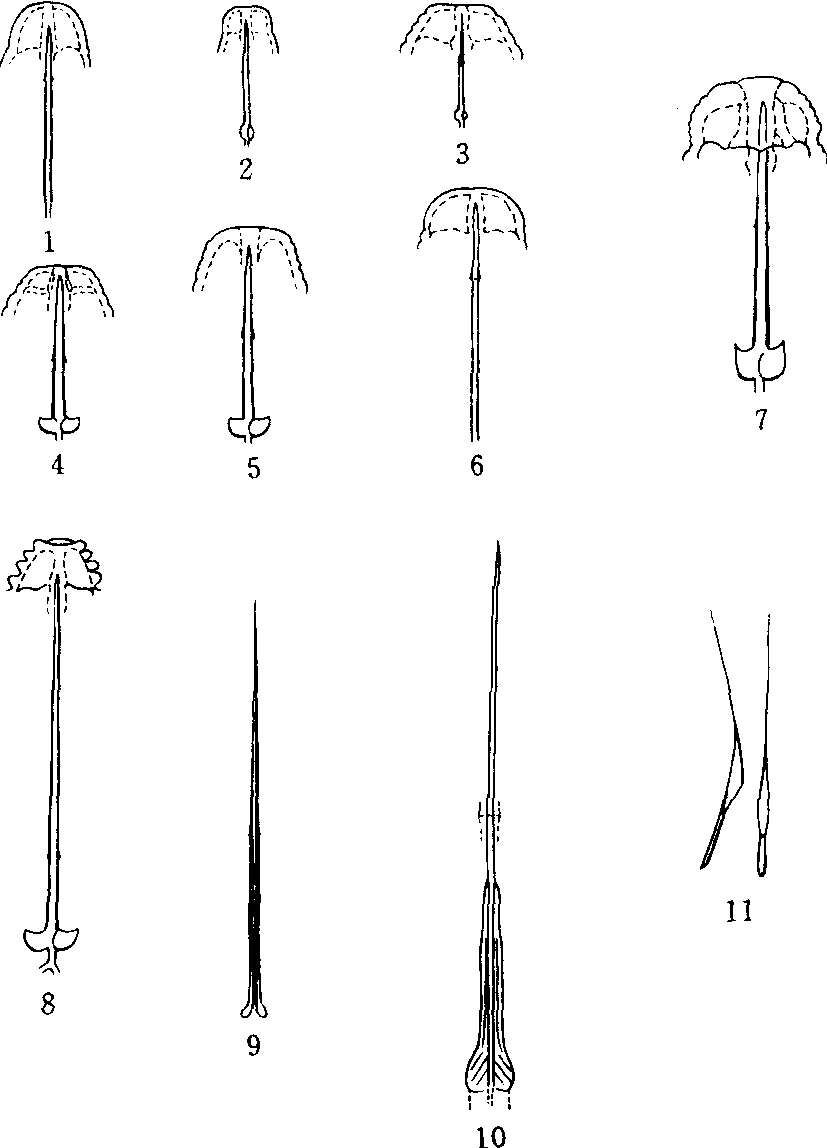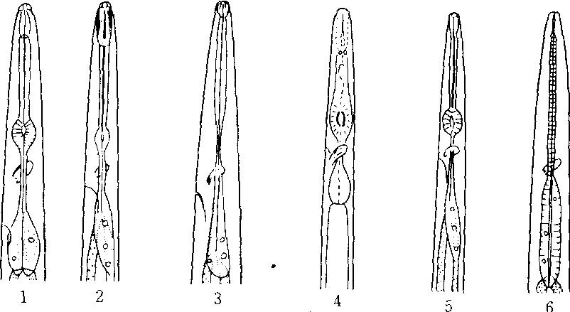 食道 口针与肠间的一段肌质及腺质的消化道,主要功能是通过抽吸作用转移线虫获得的营养物质至肠内。动物学上称为咽(pharynx)。食道有腔,常呈三射状。植物寄生线虫的食道腔上接口针腔,下连肠腔,腔内壁为角质膜,不同部位的腔外壁或光滑,或因伴生的辐射肌作各样的增厚。线虫食道的类型多样,有非常重要的分类学意义。在植物寄生线虫中,滑刃线虫目和矛线线虫目(长针线虫科和毛刺线虫科)的食道分属滑刃型和矛线型,垫刃线虫目有垫刃型、新垫刃型或环型食道(图2)。其中多数垫刃线虫的食道是垫刃型的,少数为新垫刃型食道(主要分布在伪粒线虫属和伪垫刃线虫属等属中),环型食道为环总科线虫所特有。