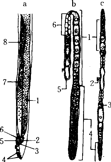 线虫生殖管 a.雄虫生殖系统:1. 肠 2. 交合刺3. 引带 4. 生殖乳突 5. 交合伞6. 泄殖腔 7. 输精管 8. 睾丸 b、c. 雌虫生殖系统类型:1. 卵巢生长区 2. 阴道 3. 受精囊 4. 卵巢生殖区5. 后阴子宫囊 6. 输卵管 |