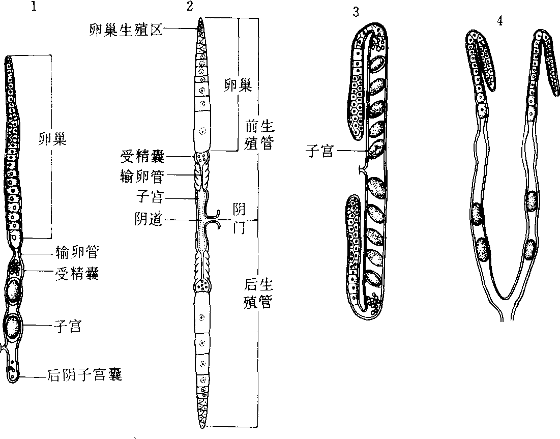 卵巢 位于生殖腺的最前端,是生殖细胞产生的管状囊,由上皮层和生殖索组成,分为生殖区和生长区。生殖区的细胞可迅速分裂增多; 生长区的卵原细胞(球状,有较大核)能逐渐增大。生殖区较短,区内细胞较小,生长区占较大位置,在寄生类群中尤为突出。卵巢的先端可能直伸,也可能回折1~2次。 输卵管 子宫和卵巢之间一个收缩的厚壁窄管,由长柱状上皮细胞组成,前端与卵巢相连。功能是分泌包围卵细胞的卵壳并将卵输送到子宫内。有些线虫输卵管基部膨大,用作受精囊。卵细胞经过此管进入受精囊。受精囊由10多个大型细胞组成,外表凸出,表面似桑椹。 子宫 一条较宽的管子。是雌性生殖腺最复杂的区域。内壁具有扁平方形的鳞片状上皮,表面覆盖一层环形纤维肌和斜形纤维肌,前端与输卵管相连。子宫的功能是贮藏卵。线虫卵在子宫内完全发育成熟,同时形成卵壳并有一定程度的胚胎发育。单子宫型线虫通常有阴门后子宫囊。后子宫囊可能是第二生殖管的残迹,能起受精囊的作用。 阴道 子宫末端的一个总管。一般很短,具有阴道扩张肌和阴道收缩肌。阴道通过肌肉的收缩和扩张将卵排出体外。阴道通向体外的开口称为阴门(或生殖孔)。阴门位于虫体腹面,常是一个腹中横裂口,由2个几丁质唇片围成,稍高出体表。阴门的位置因线虫的种类不同而不同。一般双生殖管类群的阴门位于虫体中部或中部稍后方,单生殖管的则多半位于体后部三分之一处,有些甚至到肛门附近。少数寄生性线虫的阴门位于体后部末端,如孢囊线虫(Heterodera)、根结线虫(Meloidogyne)。有些线虫能从阴门中分泌出类似胶质的物质,将卵包围形成卵囊。这种胶状物含有酚类化合物,多酚氧化酶可使卵囊由无色变成橙褐色。 雄性生殖系统 基本组成是精巢或称睾丸、贮精囊和输精管,最后开口于泄殖腔。与雌性生殖系统一样,按生殖管的数目可分为双生殖管型和单生殖管型,相应的术语为双精巢型和单精巢型(图2)。次生雄性生殖器官主要包括泄殖腔,交合刺、引带,有些线虫种类的雄虫尾部有交合伞。 精巢 在性器官的开始部分。端殖型线虫的精巢分生殖区和生长区。生长区含许多精原细胞,形成精子并在其端部成熟。尾感器亚纲线虫的精子有变型虫状、圆形、鞭毛状或圆锥形。精巢的端部可以直伸或回折或卷曲。一般来说,尾感器亚纲线虫具单精巢(根结属线虫除外)。多数无尾感器亚纲的线虫是双精巢,对生,直伸,联合成一条向后伸的输精管。极少数双精巢平行前伸。 贮精囊 生殖管的膨大部分,前端连接精巢,用于贮藏精子。少数类群的线虫具有一输出管,是贮精囊的特化管状部分,分隔精巢的生长区和贮精囊。