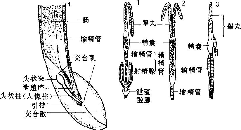 输精管 用于输送精子,是雄性生殖腺的主要组成部分。前端连接贮精囊,由管状和腺状部分组成。可以全部或仅在端部有肌肉序。精子通过输精管进入开口于泄殖腔的射精管。个别种类(如Rabditisstrongyloides)的输精管有两个前伸的大侧袋,称为射精腺,交配时分泌粘液到雌虫的阴门上。 泄殖腔 雄性线虫独有的结构,是区别于其他邻近动物的特征之一。在已知的线虫类群中,泄殖腔由输精管和直肠在腹面融合形成。无尾感器亚纲线虫的输精管在直肠末端参与融合,泄殖腔和直肠均明显。尾感器亚纲的输精管在肠一直肠瓣膜后方参与融合,致使直肠不明显。泄殖腔有容纳交合刺、引带等附属结构的囊,背面具一组形成交合刺囊和交合刺的细胞。交合刺在囊内形成。 交合刺 是一种硬角质膜结构,类似口针的针锥,由交合刺囊后壁内陷并增厚形成。可以经过泄殖腔伸出体外。交合刺分为头状突、杆身和叶片体三部分。除感觉功能外,在线虫交配时岔开雌虫的阴门并将精子输送到雌虫生殖管内。交合刺一般成对,少数一个,个别种类没有,通常向腹面弯曲或者腹面凹。交合刺的结构简单,是一个具有神经通过的空管,末端开口。开口一般位于腹面,少数在末端或背面。交合刺的形状随线虫种类不同而有差别,常见的有弓形、钩状、镰刀形、纺锤形、楔形和刚毛状等。个别植物线虫,如钮带线虫(Hoplolaimus)还在交合刺之间的泄殖腔腹侧壁上形成人象柱(telamon),帮助交合刺伸缩。 交合伞 雄虫尾部透明无色的翅状体,由交合刺前端的亚腹侧表皮角质膜伸展形成。在交配时起固着作用。交合伞经过泄殖腔区向后延伸。在尾较短的类群中,能伸到尾末端,尾长的类群,一般限于泄殖腔区。交合伞的形状可以是一简单的凸面,或呈耳状,或尖锐,或为长方形。边缘光滑或呈锯齿状。 引带 交合刺囊背壁上一个厚而膨大的几丁质结构,支撑和引导交合刺的运动。位于交合刺末端。最简单的引带只是一增厚的片状物,复杂结构的引带由固着肌肉的表皮内突、体部、楔片、头状体和基脚组成。 某些线虫还有生殖乳突,成对地分布在泄殖腔周围,有感觉作用。交合刺、引带、交合伞及生殖乳突的形状、位置和它们的有无在线虫的分类鉴定中有重要意义。 在已知的线虫中,除雌雄异体类群外,少数属内还存在着雌雄间体。一个雌雄间体是一个个体显示出雌虫和雄虫性特征。如三叶草茎线虫,雌虫的卵巢、子宫、阴道和阴门均发育良好,但又在虫体另一部分上产生交合刺、交合伞和生殖乳突等雄性生殖器官。爪哇根结线虫,雄虫有正常的睾丸、交合刺和引带,同时又显示出不同程度的阴门发育。 生殖方式 线虫一般是两性异体的,通过雌雄性线虫交配产卵进行生殖。按雌虫所产卵的发育程度分为卵生和卵胎生两种。卵生类型的雌虫产生的卵未分裂或处于不同发育阶段。卵胎生类型的卵在雌虫子宫内已发育完全,并且幼虫在子宫内孵化。许多植物寄生线虫属于卵胎生。在雌虫和雄虫有相等数量的两性类型中,卵的发育必须由雄虫交配和卵受精。但在许多自由生活和植物寄生线虫中,雄虫数量远远少于雌虫,导致出现雌雄同体和单性生殖的趋势,同时还有各种雌雄同体和单性生殖的中间类型,其中雄虫稀少的个体大多数失去性本能。 雌雄同体 的线虫通过自体受精进行生殖,精子和卵子产生于同一生殖腺内,称为合殖型。在大多数情况下,生殖腺先产生精子并贮存起来,与后来在同一生殖腺产生的卵受精。这种雄性早熟的雌雄同体类群中,可能有减少数量的雄虫,但一般不再有功能。这种现象在自由生活的小杆目中很普遍。植物寄生线虫还有双殖型类群,美国学者培里(Perry)1959年报道了螺旋线虫属中双殖型的例子。双殖型雌雄同体是精子与卵子产生于同一个体的不同生殖腺中。 单性生殖的类群是完全没有雄虫,生殖时卵不经受精而发育。已经证明,有些自由生活的线虫和部分植物寄生线虫有单性生殖现象。另外,在雌雄间体的类群中,显示第二雄性特征的雌性雌雄间体与雄虫交配是能孕的。 |