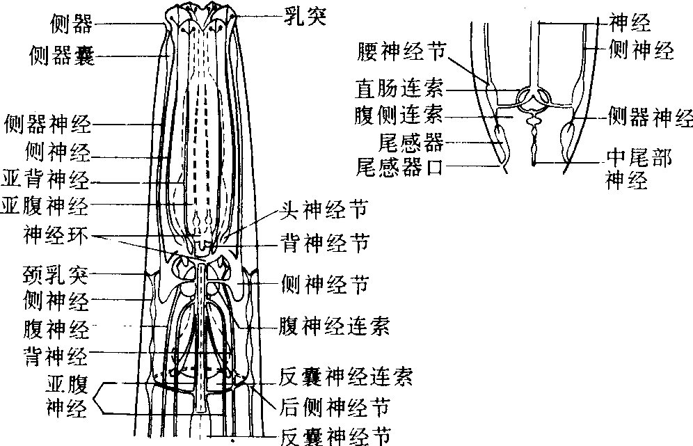 神经环 线虫的中心神经由中枢神经组织和腹神经节链组成,围绕食道狭部。从神经环发出神经向前到侧器和头感觉器,向后伸到尾部。发出的神经中以腹神经和联系神经节最明显、最发达。 神经节 神经环前方有6条小的、放射状的头乳突神经节。神经环后方的神经节很集中。背神经节、2条大的侧神经节和腹神经节位于神经环后方。6条头乳突神经节从前方与神经环相连,它们是2条亚背神经节,2条侧神经节,2条亚腹神经节。每条神经包括3~7个两极感觉神经原,其体轴索从每个神经节的后边通过直接进入神经环。轴索的树突形成6条头乳突神经。它们截止于头感器的3个螺环末端。 感觉器官 线虫的感觉器官不发达,一些自由生活的种类,体表有刚毛,植物寄生线虫仅有乳突和侧器。分布在其中的神经分别称头乳突神经、侧器神经、生殖乳突神经、颈乳突神经、体壁神经和尾感器神经。 头部感觉系统 头部有6条唇内神经,每条具2根纤毛,在前庭内开口。每条唇外侧神经只有一个短纤毛状突起,可能是侧唇片退化和侧器囊比较大所致。其他4条亚中外唇神经在不妨害4条亚中头神经前提下可能移动位置。外唇神经和头神经都不开口,但有外露的突起,这些神经在头表皮下就截止。侧器神经有11条纤毛突,其中7条关闭在侧器抱器内突中。 侧器 唇区侧面的一对化学感受器,一般在口器附近。侧器开口呈裂缝状,有横裂、纵裂和斜向裂开的,偶尔裂缝较长并弯曲。侧器囊小,有6~8个管状感受器,3~6个鞘感受器。 颈乳突 部分尾感器亚纲(Secernentea)线虫有一对颈乳突,位于线虫颈区排泄孔附近,每个感觉细胞在中外侧神经节处,是一种体侧感觉器。 半月体 是一种联系神经系统的构造。由连接神经环和腹神经带的亚腹神经连合形成。尾感器线虫的半月体位于排泄孔附近。 生殖乳突 雄虫肛区与生殖孔突神经索相连的乳突。肛门前有成对的乳突,受腹侧神经上的两极轴索控制。乳突发出树突与侧腹神经相连; 肛门后的乳突或称尾乳突在腰神经节里有神经细胞。包括尾感器在内的所有肛门后感觉器官均由侧尾神经控制。 尾感器 尾部的一对化学感受器,少数位于肛门前方甚至不规则地分布在虫体其他部位,但一般在侧带区内。尾感器有一个纤毛感受器和一条联系神经,通过一小孔开口于体表。尾感器有一个由鞘细胞分泌的多糖形成的栓塞。栓塞有的小、有的大、有的呈盾形。 |