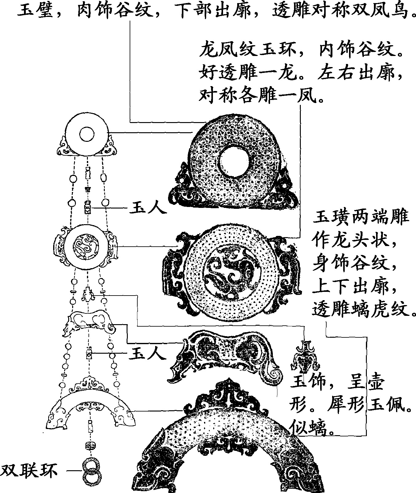 | 释义 | 组佩zǔpèi官员用以系玉的组带及玉佩,以组的颜色和玉佩的种类区分等级。全佩由数件或数十件玉器组成与礼制有关的成套佩玉。又称全佩。组织方式多样。在纵向上一般可分三个层次:最上面有一件玉起全佩的汇总作用,其他所有玉都系于其上,这件玉通常是小型的璧或环;中间为全佩主要部分,多为精致且形体较大的璧、璜、珑,一件或数件并列;下层多小件饰物,如觿或小璜之类,往往左右对称配置。凡数件并列对称配置的,一般用珩璜为中介件。《梁书·陈庆之传论》:“庆之警悟,早侍高祖,既预旧恩,加之谨肃,蝉冕组佩,亦一世之荣矣。”唐白居易《东都冬日会诸同年宴郑家林亭》诗:“宾阶纷组佩,妓席俨花钿。”《旧唐书·崔神庆传》:“开元中,神庆子琳等皆至大官,群从数十人趋奏省闼。每岁时家宴,组佩辉映,以一榻置笏,重叠于其上。”