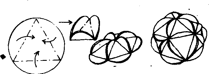 利用多片纸张组合粘接成的吊挂装饰彩球。制作方法是剪20个大小相同的圆形纸片,沿圆片的内接等边三角形,向上折叠3个弧形边,将20个圆片的弧形边对粘,使每个粘接中心周围成五个三角形的组合体,二十个圆片便组合成一个花边彩球。