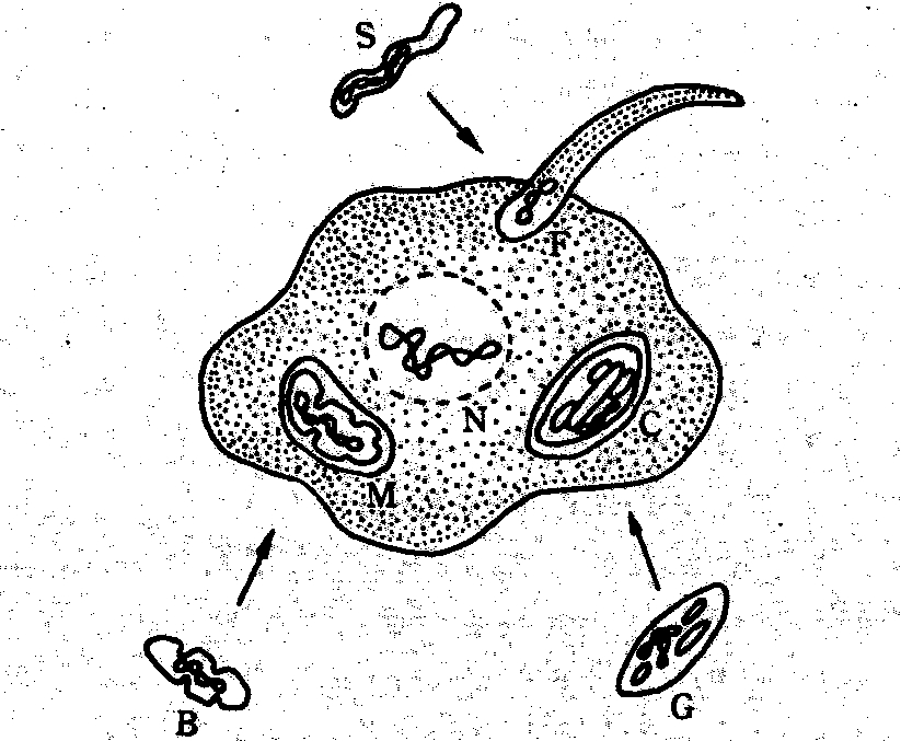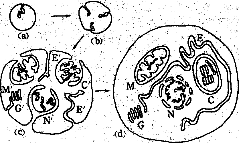 图 1 真核细胞的内共生起源学说图解 N. 前核宿主细胞; B. 好气细菌; G. 蓝藻; S. 螺旋体; M. 线粒体; C. 叶绿体; F. 鞭毛 但是,内共生学说不能解答下列问题: ❶其他细胞器,如内质网、高尔基体,尤其是细胞核及核被膜的起源。 ❷厌氧和异养比好氧和自养生活方式原始,在进化中后者反而“归顺”于前者,似不合生存斗争规律,而且厌氧宿主无法解决氧毒问题。 ❸叶绿体和线粒体的自主性是相对的,因大部分成分仍靠核—质系统供应; 如果这些必需基因是共生后才由细胞器转移并重组入细胞核,则此种大规模的基因转移和重组在生物界尚a无先例,且由此所形成的基因组相当于异多倍体化的镶嵌体,已知它的信息传递效率不高,易受进化的淘汰; 当不同种族,尤其是远缘种间基因重组时,会受到特异性很强的限制性内切酶攻击,表现为细胞内部的免疫反应。 ❹在中心体内至今未发现存在独有的遗传系统; 真核细胞鞭毛的组成、结构和性能均不同于细菌鞭毛,故无进化上的直接联系。 ❺线粒体和叶绿体的某些特性与细胞核和原核细胞均不相同,如褐孢霉素能抑制原核和真核细胞核的蛋白质合成,但对线粒体和叶绿体无效; 原核细胞与真核细胞核的核糖体中均有5S rRNA,而线粒体无,叶绿体虽有,但结构不同于原核细胞而同于细胞核系统; 细胞器基因组中有内含子结构,亦为细胞核特征,而原核细胞则无。 ❻黄化植物细胞内叶绿体退化,照光后可重新由微小的前质体组合成叶绿体;酵母菌细胞在厌氧条件下,线粒体退化成两端开口的扁平膜片结构,亦可在有氧时重建。此类再生生命循环在任何原核细胞中未见; ❼用突变理论代替进化论,把复杂问题用简单的方式来解决似不合理。