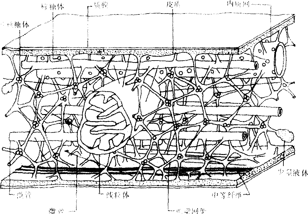 图511 细胞骨架示意图 细胞骨架由微管、微丝、居间纤维和微梁共同构成的立体网络系统。对维持和支撑细胞,影响细胞运动等起重要作用。 细胞骨架cytoskeleton真核细胞中一种极其复杂的网络系统。包括几类大小和化学性质不同的纤维,即微管(直径20~25 nm)、粗纤维(直径10~20 nm)、中间纤维(直径7~10nm)、微丝(直径5~6 nm)和微梁(直径3~5 nm)。它们在细胞内有特定的形态与分布,对保持细胞的形态、以及在细胞运动、细胞内运输、内吞外排、免疫行为、细胞分裂和信息传递等方面都起着重要作用。 |
