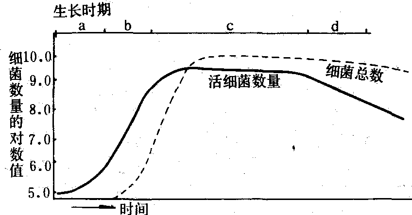 生长滞留期 菌种接入一个新鲜培养基内,由于营养条件和环境各因素不可能完全合适,需有一个调整自身生理机能的过程而逐渐适应这个新的生活环境,因此在开始一段时间内生长滞留,细胞数几乎不增加,群体的生长率近于零,曲线平延。但在这个时期内,菌体体积逐渐增加,细菌内原生质均匀一致,贮藏物质消耗,DNA含量增高,产生各种诱导酶,逐步进入生理活跃状态,从培养环境中吸取营养物质,合成细胞物质,为分裂增殖作了准备。群体中有少数细胞首先开始分裂,曲线稍有上升。偶亦稍有下降,系因接种的细胞群中有生活力低、不能立即适应新的环境而死亡,减少了活菌数所致。生长滞留期的长短,因菌种和培养条件不同而异,自1~2小时至几十小时不等。同一菌种,用以接种的菌体细胞所处的生长阶段不同,影响生长滞留期的长短。 对数生长期 曲线在对数生长期呈直线上升,表现了接种的细菌在所处的生活环境中最活跃的生长阶段。旺盛的代谢活动,高效率的合成细胞物质,细胞分裂的时间间隔缩短,使大部分细胞处于等速分裂而达到最高的生长率。这一时期中的细菌的生长特征是细胞数量增加与时间成指数关系,每经过一个单位时间,细胞数量作倍数增加,保持一致的生长率、故又称指数生长期,曲线上升的坡度和高度受微生物种类、营养条件和环境条件的左右。 根据测定对数生长期的生长量(细胞总数)可以讦算一种细菌在一定的生活环境中的最高生长率和每分裂一次所需的时间,称为代时(G)。