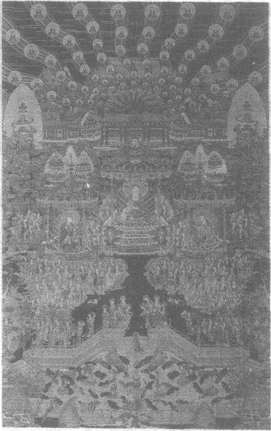 | 释义 | 织锦极乐世界图轴清,纵448厘米,横196.5厘米,画心高289厘米,宽175厘米。北京故宫博物院藏。“极乐”是佛土名称,即阿弥陀佛的国土,又作安养、安乐、无量清净土、无量光明土、无量寿佛土。此图轴织锦地组织为三枚左向经斜纹。花纹组织为三枚左向纬斜纹组织。经线密度每厘米50根,纬直径为0.2—0.25毫米。在石青地上,以红、蓝、绿、橘黄、橙水红、香色为主,配以近20种不同颜色的彩色丝线,运用颜色平涂上色,细线勾勒,彩色纬丝显花的方法,形成青蓝基调上的鲜明对比。在对比色相接地方,采用浅色相间,墨线勾边,使画面深、浅、明、暗起伏变化。织锦极乐世界图轴,以极其丰富的想象力描绘西方佛国的种种情景,画面中心是佛祖阿弥陀佛,在阿弥陀佛前面稍下的位置,左右各有一菩萨,一是观音菩萨,一是大势至菩萨,也有人说一个代表未来,一个代表过去。阿弥陀佛、观音和大势至都打坐于有宝装华锦的、庄严富丽的建筑物中。屋顶上有五彩祥云缭绕,祥云之上是天界,传说阿弥陀佛能变成千佛,故画面在天界中心放射出对称十道佛光,每道佛光上有数尊佛像,十道佛光中共有88尊佛像,它们是阿弥陀佛的化身。围绕着一佛二菩萨,还对称织有许多供奉的菩萨、天王神将、金刚罗汉、夜叉力士、伎乐队等等共278个神态不同的人物,并配有宝莲池。池中长满了荷叶和代表“九品”的九朵盛开的莲花,每朵莲花上跪着一个转生人物,正中最大的一朵莲花上为转生的佛,两旁的莲花上是转生的两尊菩萨,其余是转生的罗汉僧众和供奉的菩萨。其间点缀了几只栩栩如生的孔雀及黄鸟。此图轴繁花富丽的主体纹样与深邃幽静的夜色,使世俗气息与神秘的幻觉交织而成,既有现实生活的意境,又有梦幻世界的仙境,堪称清代织锦上乘佳品。