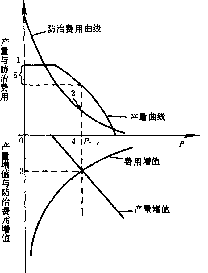 式中 O为总防治费用; L为影响增大费用的常数;Pt为种群密度。 根据上述两条曲线可分别计算出不同种群密度下的产量增值和防治费用增值。将两条曲线合并即可看出害虫防治的经济阈值。图2中的点1为无害虫时或损失在统计学上无意义时的正常产量;点2是产量函数变化率与防治费用变化率的等值点;点3是防治费用增值与产量增值的等值点;点4为对应于点2和点3的害虫种群密度,即为害虫防治的经济阈值或防治指标。可以看出经济阈值就是害虫增长引起的损失等于防治此种损失所需费用时的种群密度。 动态法 阈值是动态的,可随经济和环境条件的变化而变化,须分析害虫、作物、天敌、气候等环境因素各变量间的相互关系,在建立系统模型的基础上求得多维经济阈值。美藉华人姜淮章(H.C.Chiang,1979)提出经济阈值应包括害虫生活早期达到该阈值的种群密度及随后发展到能引起经济损害的生活后期种群密度过程中涉及的有关因素,其一般模式为: