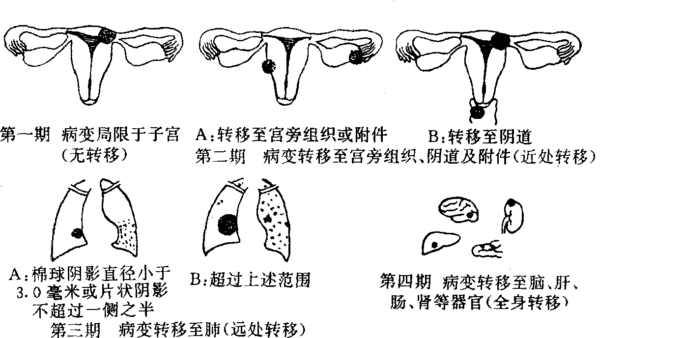北京协和医院根据多年临床资料分析,提出绒癌的临床分期(见图7.4-3),以说明病变发展程度,在临床诊断及治疗中很有价值。