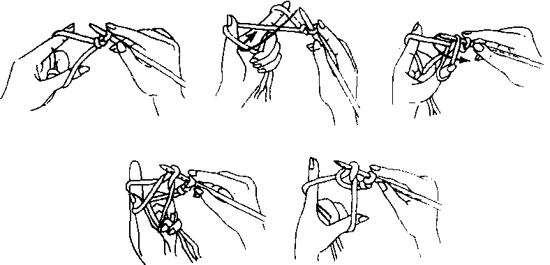 棒针编织法包括起针、下针、上针、加针、并放针、扭针、交叉针、挑针、浮针、拉针、兜针、长针、收针和缝合等。最基础的编织法除起针、收针和缝合外,其它针法都是由下针、上针、加针、减针这四种针法变化而来的。起针:一般起针法、活结起针法、卷加针法和双边起针法等。一般起针法:先将绒线打一活结,右手握棒针穿入活结,左手中指、无名指和小指握绒线,拇指和食指分别将短端和长端绒线撑开(如图a),右手将棒针针尖由外向里通过挂在左手拇指上的绒线(图b),将食指上挂的绒线由外向里挑(图c),再从拇指挂绒线处返回(图d),拇指抽出(图e),拉紧绒线便成一针,依此循环。下针:最简单最重要的基础编织法。左手拿挂针圈的棒针,右手拿棒针由上向下插入左棒针的第一针针圈,右手食指将绒线绕上右棒针的尖端从针圈中挑出,同时左棒针上的针圈脱掉。依此从右向左顺序编结。上针:右棒针由下向上插入左棒针的第一针针圈,将绒线绕上右棒针的尖端,从针圈中挑出,同时将左针上的第一针圈脱掉。依此从右向左顺序编结。加针:下针加针将绒线甩上继续结下针;上针加针将绒线在右棒针上绕一下继续结上针;无洞加针右加针在左棒针第一针的前一行的针圈中结一针下,再结左针上的第一针;左加针在左棒针先结一针下,再在这针前一行的针圈中结一针下;放针是一针放三针,在一个针圈内先结一针下,再结一针上,再结一针下。依此也可一针放四针、五针、六针等。减针:两针并一针是右棒针向下先插入左棒针的第二针针圈再插入第一针针圈,将绒线绕在右棒针尖端从两针针圈中挑出,两针圈脱掉,即用下针将两针并成一针。也可用上针将两针并一针。还可以用上针或下针将三针并一针。下针拨收针是右棒针先从左棒针挑过一针,结一针下,再将挑过的一针拨过覆盖在一针下的上面。上针拨收是交换二针位置,用上针将二针并结成一针。
