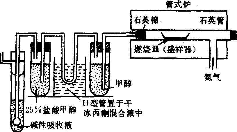 为了对农药结合残留进行定性分析,汗(S.V.Khan)等人在1980年曾报道用管式炉对含有14C标记农药结合残留的土壤样品进行氦气保护下的高温蒸馏。试验装置如下图所示:
