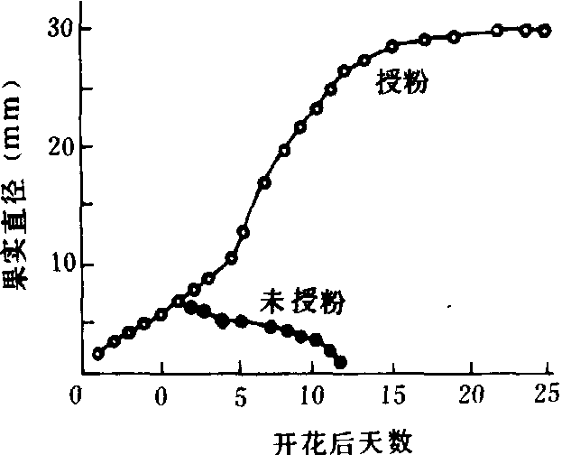 授粉对黄瓜子房生长的影响曲线图 种子发育也影响果实发育。正常授粉和受精后,胚发育成种子时产生大量激素而刺激子房膨大。种子的发育与否及种子的多少,影响到结实率的高低,影响果实的形状、大小,甚至影响果实的化学组成。如番茄果实重量与该果实的种子重量成正相关。种子发育不均匀,会产生畸形果。 有些作物不经过有性生殖过程也能结成果实,称“单性结实”。单性结实不产生种子,成为“无子果实”。单性结实有两类:一是自发性单性结实。它不经授粉、受精而发育成为果实。黄瓜中能单性结实的品种用于保护地栽培,不需授粉也能结实。茄子、西葫芦早期的花不能单性结实,但晚期的花有的可单性结实。二是刺激性单性结实。如花粉、气候因素(如低温、霜冻等)、植物生长激素的刺激。花粉的刺激是指不经受精但需花粉的刺激才能结实。可以是自花的花粉或异种花的花粉。如: 茄子×矮牵牛; 番茄×茄子;辣椒×酸浆;黄瓜×南瓜等异种花粉皆无受精能力,但具有刺激果实膨大的作用。在栽培三倍体西瓜时,三倍体植株虽有雌花,但不育,须由普通二倍体西瓜的花粉的刺激才能结成无子果实。植物生长调节剂可用以诱导果菜类蔬菜产生单性结实或无子果实,生产上常用的有2,4-D、萘乙酸(NAA)。对氯苯氧乙酸(PCPA)、赤霉素等。 茄果类及瓜类蔬菜在低温下分化的花芽,往往成为畸形花、两性花、双子房花,或具有很多心皮的子房。这些子房发育成为短小而多心皮的畸形果实。品种特性和营养生长状态是形成畸形果的内因,如番茄的小果型品种,子房的室数较少(2~3室),倘若营养生长正常,即使在低温下分化花芽,也很少形成畸形花及畸形果。瓜类蔬菜雌花开放期间,遇低温、高温、干旱或多雨,以至授粉或受精不完全,营养或水分不足也会产生畸形果。如粉皮冬瓜花期遇冷风,气温骤然降低形成瓜蒂部尖的果实。西瓜授粉期间遇高温、干旱而导致歪果。在保护地栽培中通风不良,白天气温出现40℃左右的高温,也是形成畸形果的主要因素之一。防止畸形果的产生,可以通过栽培管理措施,如施肥、灌水及控制温度,改善花期的授粉条件,以促使正常授粉,而不产生畸形果。 |