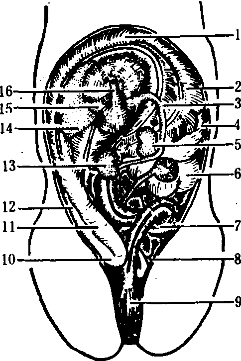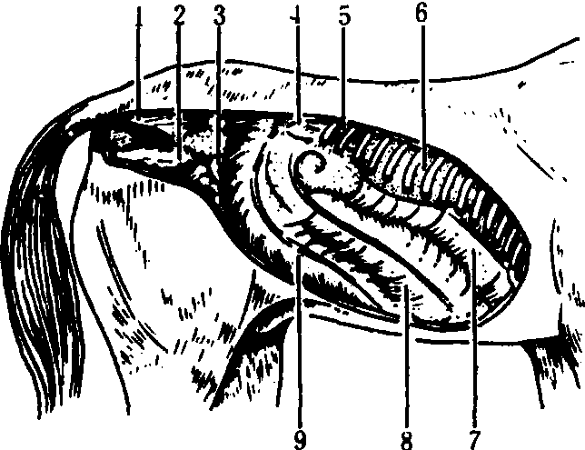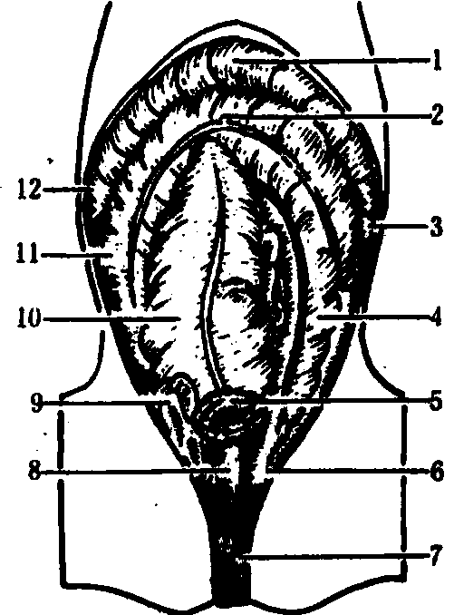 图 6 马大结肠示意图 寻找结粪时,应由后向前,左右上下仔细寻找。各个部位结粪的判断如下:❶直肠结:即积聚在直肠及玉女关内的干硬结粪,手入直肠即可摸到。严重时肠粘膜可出现水肿。 ❷小结肠结:结粪坚硬如拳头大,呈圆形或椭圆形,有时两三个或多个粪球连在一起。活动性大,容易牵引,位置多不固定,以在腹腔左后部者为多。 ❸骨盆曲结:位于左腹腔后方耻骨前缘,肠管呈肘样弯曲,粗如手臂,结粪坚硬,表面光滑,左下大结肠也多有大量积粪。有时向后伸入骨盆腔内或伸向腹腔右方,可左右和向前移动。 ❹左侧大结肠结:位于腹腔左下方。左下大结肠与左下腹壁接触,形如大腿,后端较细,与骨盆曲相连,前端较粗大,内积坚硬结粪,并可触知高低不平的肠袋和肠纵带。左上大结肠位于左下大结肠的上方,肠管较左下大结肠细,形如手臂,内积坚硬结粪。表面光滑,常呈椭圆形,摸不到肠袋和肠纵带。上下大结肠之间有短的系膜相连。 ❺盲肠结:位于腹腔右侧, 可在右腹胁部摸到表面凸凹不平的向前下内方腹腔底壁伸延充满坚硬结粪的粗大肠管。 ❻胃状膨大部结:位于腹腔右前方盲肠底部的前端略靠内侧,可摸到呈半篮球状并可感到随呼吸而前后移动的坚硬阻塞物。 ❼小肠结:可在腹腔内摸到如小臂粗、椭圆或圆柱形、表面光滑而坚硬的阻塞物,阻塞物的前侧并有积液感。如为十二指肠结,位于右肾后下方横向左肾下面,位置较固定,不易移动。空肠结,肠管游离性大,位置不固定,但多盘曲在腹腔左侧;回肠结, 由左肾后下方横向右上方,与盲肠底部相连,形状与空肠相似,但肠壁较厚。 治疗 结症主要为肠腔阻塞不通,治宜破结通下为主。根据患病部位和病情轻重等不同情况,可采用捶结、掏结、药物、针刺等疗法施治。由于结粪部位的不同, 治疗方法也不尽相同。小结肠结、左上大结肠结和骨盆曲结, 以捶结术和掏结术为主; 左下大结肠结、胃状膨大部结和盲肠结, 以药物治疗为主: 小肠结以握压法和药物治疗为主; 直肠结以燕子衔泥法为主。 捶结术 主要用于治疗小结肠结、左上大结肠结和骨盆曲结。术者按直肠入手法将术手伸入肠腔, 摸到结粪后, 将结粪牵引到肷窝腹壁处,拇指屈于掌心,其余四指并拢,将结粪以掌心或虎口固定于腹壁内,外手或由助手握拳隔腹壁对准结粪垂直捶打。捶打用力要由轻而重, 三、四拳即可将结粪捶碎。结粪捶开后,术手即可感到肠道有气体向后通过,病畜随即放屁,腹胀和腹痛很快消失, 随转痊愈。 掏结术 主要用于左下大结肠结、盲肠结、胃状膨大部结、小肠结和直肠结。常用手法有:❶挤压法:里手拇指屈于掌心, 其余四指并拢, 将结粪固定于腹壁, 外手或由助手隔腹壁反复用力挤压结粪, 将结粪压碎, 主要用于左下大结肠结; 或将结粪牵引到耻骨前缘, 术手弯曲成半月状进行挤压, 主要用于位置靠后的骨盆曲结和小结肠结; 或由助手用木杠插入六柱栏横梁内将结粪处的腹部撬起, 术手将结粪牵引到木杠上挤压, 主要用于位置靠前而不易向后牵引的小结肠结。 ❷切压法: 术手拇指屈于掌心,其余四指并拢,用指肚有秩序地将结粪纵切成沟或横切成段。用于左大结肠结和盲肠结。 ❸握压法:术手拇指屈于掌心,其余四指并拢, 握住结粪,以拇指关节为支点反复握压,将结粪握碎。用于小肠结和小结肠结。 ❹顶压法: 术手拇指屈于掌心,其余四指并拢,用指肚顶压结粪。用于胃状膨大部结。 ❺直取法和燕子衔泥法: 直取法是以术手拇、食、中三指或五指插进结粪周围与肠壁之间, 捏住结粪慢慢向后牵拉, 将结粪整个取出; 燕子衔泥法是以术手拇、食二指或拇、食、中三指在结粪中心将结粪作燕子衔泥状一点点地取出。用于直肠结和玉女关结。 在捶结和掏结过程中, 必须小心谨慎, 严防粗心大意和鲁莽, 以免损伤肠壁和造成肠断(肠穿孔)等不良后果。如遇肠壁严重损伤或穿孔,应及时手术治疗。 药物治疗 以通肠利便、消积理气为治则。各部位的结症均可采用, 尤其对粗大肠管的阻塞, 因单用掏结术难以达到治愈目的, 应以药物治疗为主。其他部位的结症, 在捶结或掏结不充分时, 也需适当配合药物治疗。主要治法有:❶植物油500~1000毫升,胃管投服。主要用于小肠结, 也可用于大肠结。如继发大肚结, 用胃管导出胃液后投服。 ❷大承气汤加槟榔或加味承气汤(《中兽医治疗学》: 大黄、芒硝、枳实、厚朴、酒曲、麻仁、青木香、香附、木通)。主要用于大肠结。 ❸当归苁蓉汤:用于老弱、虚寒结症病畜。体瘦气虚加黄芪; 孕畜减瞿麦、通草, 加白芍。 ❹食盐200~300克,加温水5000~8000毫升,胃管投服。用于大肠结。 ❺大量温水或1%食盐水深部灌肠,以兴奋肠蠕动、软化结粪和补充水分。 电针关元俞穴, 或耳钉穴、大孔穴留针。 采取以上疗法过程中,根据病情轻重和发展变化,可单采用某一疗法, 也可采用综合疗法。此外, 还须考虑对症治疗。如继发大肚结时,应用胃管导出胃液;继发肚胀时, 应穿刺放气; 继发肠绞痛时, 应剖腹手术整复; 腹痛剧烈时, 应镇静止痛; 失水严重时, 应予补液; 心衰竭时, 应予注射强心剂; 顽固性和多部位结症,采用一般疗法无效时,应予剖腹取结治疗等。 加强护理病畜, 适当牵遛, 制止起卧打滚, 常予饮水, 防止受寒。 结症impaction of intestines又称肠阻塞。中兽医学病名。马属动物在肠道内积粪而引起便秘的一种疾