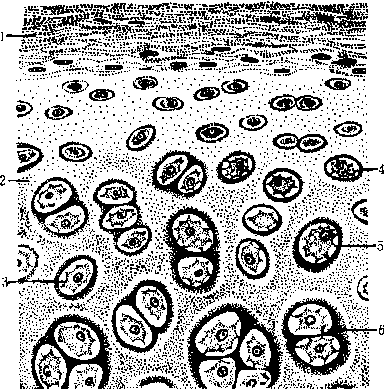 纤维 细胞间质中的有形成分,依纤维的形态结构不同分为三种。❶胶原纤维: 为主要纤维,新鲜时呈白色又称白纤维。它长短不一,粗细不等。每条胶原纤维由更纤细的胶原原纤维借少量蛋白多糖的粘合质连结而成,纤维有分支,纵横交错,多呈波浪形行走。其化学成分是胶原蛋白,在沸水或弱酸中易膨胀变成明胶,易被酸性胃液消化但不易被碱性肠液消化;它韧性大、抗拉力强但缺乏弹性。 ❷弹性纤维: 数量较少,新鲜时呈黄色,又称黄纤维。有分支、粗细不等,常毕直行走,它由弹性蛋白组成,具有很大弹性,抗酸抗碱性强,加热不易分解,易被胰液消化。 ❸网状纤维: 数量很少,主要分布于毛细血管周围和结缔组织与上皮交界处的基膜中。纤维很细,分支多,互相吻合成网。其化学成分也是胶原蛋白,因其表面附着有较多的酸性蛋白多糖,显嗜银性,故又称嗜银纤维。在胃液和弱酸中都不溶解。 基质 为均质、透明、粘稠的胶状物质。主要化学成分是蛋白多糖,多糖中含有透明质酸、硫酸软骨素、硫酸角质素和肝素等,蛋白部分是糖蛋白,它们共同形成带有微小孔的分子筛,其周围有流动着的组织液(包括水、无机盐、葡萄糖、维生素及激素等); 分子筛容许小于孔径的物质通过(如葡萄糖、气体分子和代谢产物等),大于孔径的大分子异物如细菌、异物颗粒或毒素等则不能通过,因此,基质对后者的扩散起着屏障作用。有的细菌(如溶血性链球菌等)能分泌透明质酸酶,分解透明质酸,破坏基质的屏障作用,从而引起病菌扩散、炎症发生和蔓延。 致密结缔组织 由大量粗大而紧密排列的纤维成分和少量细胞成分组成,后者主要是成纤维细胞,基质成分少。形态固定。根据组织中纤维性质的不同可分致密胶原结缔组织和致密弹性结缔组织两种,前者胶原纤维数量多,粗大,排列紧密,常集聚成束,成纤维细胞分散于纤维束之间。如肌腱、韧带、皮肤的真皮和器官的被膜等; 后者含有大量弹性纤维,主要分布于大动脉的中膜和项韧带等处。在体内主要起支持、连接、缓冲和保护等作用。 网状组织 由网状细胞、网状纤维和基质组成。网状细胞呈星状,有突起; 核较大,圆形或椭圆形,胞质较多,相邻细胞的突起以桥粒连接成网,网孔中充满基质(组织液或淋巴液)。网状纤维由网状细胞产生,性质与疏松结缔组织的网状纤维相同,但数量较多且粗,它沿着网状细胞表面分布并由其突起包裹。分布于淋巴器官、淋巴组织和骨髓等处,是造成血细胞发育的微环境。 脂肪组织 由大量脂肪细胞聚集而成,基质甚少,被少量疏松结缔组织、血管和神经等分成许多小叶。根据颜色、血管、神经分布及脂肪细胞结构不同分为两种。一种是白(黄)脂肪组织,其血管、神经不发达,脂肪细胞的形态、结构与疏松结缔组织的脂肪细胞相同。分布于皮下、网膜、骨髓等处,有贮存脂肪和保护体温等作用。另一类是棕色脂肪组织,含有丰富的血管和神经,脂肪细胞的胞质内含有多个脂肪滴,核椭圆形位于中央,线粒体较多。在冬眠动物和大多数哺乳动物(包括人)的幼体及成体都有,但猪缺如,它能产生大量热能,有利于幼体抗寒和动物冬眠时维持体温。 软骨组织 由少量软骨细胞和大量固态的细胞间质构成,具有一定的硬度和弹性。细胞间质包括基质和埋藏于其内的纤维。基质的化学成分是软骨粘蛋白,其中主要成分是酸性糖胺多糖,内含丰富的硫酸软骨素和硫酸角质素,还有蛋白质等,并结合有大量的水分。软骨细胞呈圆形或椭圆形,分布在基质形成的软骨陷窝内,陷窝周围的基质较浓厚形成软骨囊; 基质内有不同的纤维,有胶原原纤维、弹性纤维、或胶原纤维等。软骨组织与软骨膜共同构成软骨器官(简称软骨),后者是软骨周围的致密结缔组织,内含丰富的血管、神经和成软骨细胞,在软骨生长、创伤修复中起着重要作用。软骨组织内无血管和神经,其营养靠软骨膜的血管通过渗透作用供给。软骨在体内起着支持、滑动和骨的连接等作用。根据软骨基质中纤维成分不同分为三种软骨,即透明软骨、弹性软骨和纤维软骨。 透明软骨 呈半透明的玻璃状,性质较脆,基质中含有少量很细的胶原原纤维,它与基质的折光性一致(图2),故在普通染色切片中难以区别。在软骨囊处基质含硫酸软骨素较多,而远离软骨囊的基质中含胶原原纤维较多。软骨浅层的细胞较幼稚,较小,呈扁平或椭圆形,常单个存在; 向深部,它长大呈椭圆形或圆形,能进行分裂,从一个母细胞分裂来的子细胞(2~8个)常聚集在一起,外包软骨囊称同源细胞群。